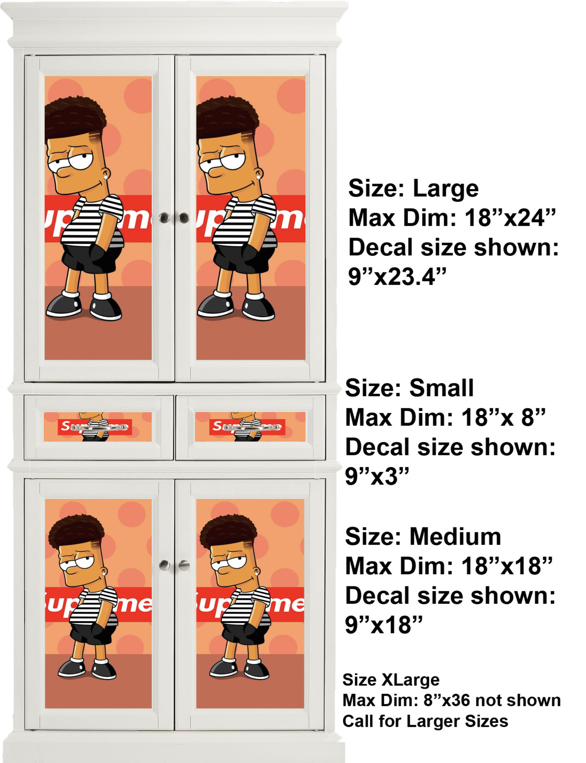 We print your customized design in full color, onto a high quality vinyl, covered with a glossy finish. For attachment to the cabinet, each cabinet sticker is accompanied by an easily applied, adhesive backing. The adhesive backing also guarantees a smooth removal or repositioning if desired. We sell these decals in four different sizes, but each size can be downsized appropriately to fit the needs of your kitchen. We offer a small, which is 18 by 8 inches, a medium, which is 18 by 18 inches, a large, at 24 by 18 inches, and an extra large, at 36 by 18 inches. We advise that you measure your cabinets first so you can make a properly informed purchase. For those who are interested in purchasing decals larger than 18 by 36 inches, please contact our team.