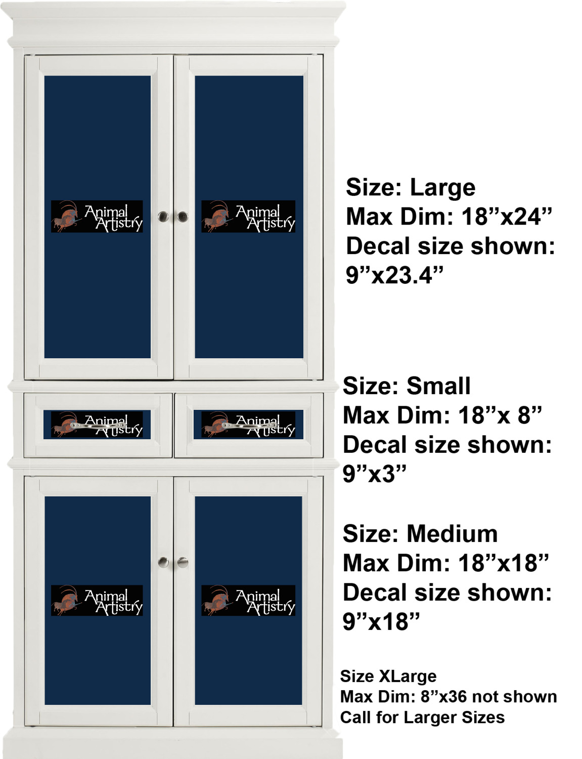 We print your customized design in full color, onto a high quality vinyl, covered with a glossy finish. For attachment to the cabinet, each cabinet sticker is accompanied by an easily applied, adhesive backing. The adhesive backing also guarantees a smooth removal or repositioning if desired. We sell these decals in four different sizes, but each size can be downsized appropriately to fit the needs of your kitchen. We offer a small, which is 18 by 8 inches, a medium, which is 18 by 18 inches, a large, at 24 by 18 inches, and an extra large, at 36 by 18 inches. We advise that you measure your cabinets first so you can make a properly informed purchase. For those who are interested in purchasing decals larger than 18 by 36 inches, please contact our team.
