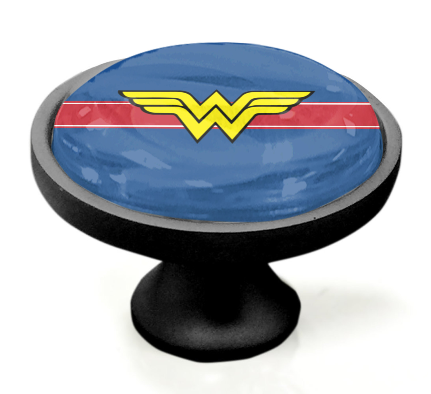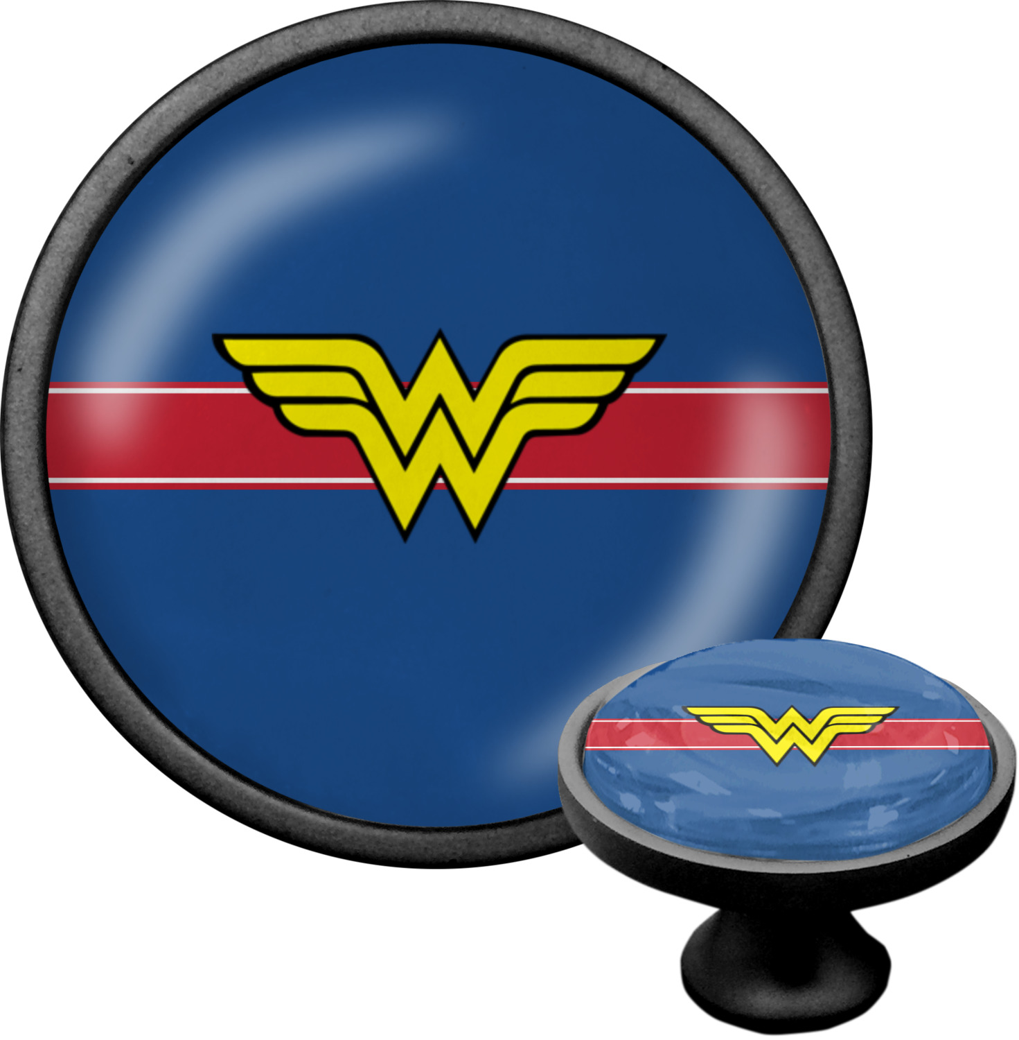 We sell these cabinet pulls in two different colors to better match your room's color scheme. We offer an oil-rubbed bronze base that is black in color, and a satin nickel option, which has a silver color. Your design is displayed across a high gloss vinyl insert that is placed on top of these cabinet handles. We then place a 1 inch thick glass cabochon atop the design, which seals the cabinet knob and makes the colors of your customization stand out. These custom cabinet knobs are approximately 1.3 inches in diameter. Your purchase includes a 1 inch screw that can be used to mount the knob to any cabinet in your home.