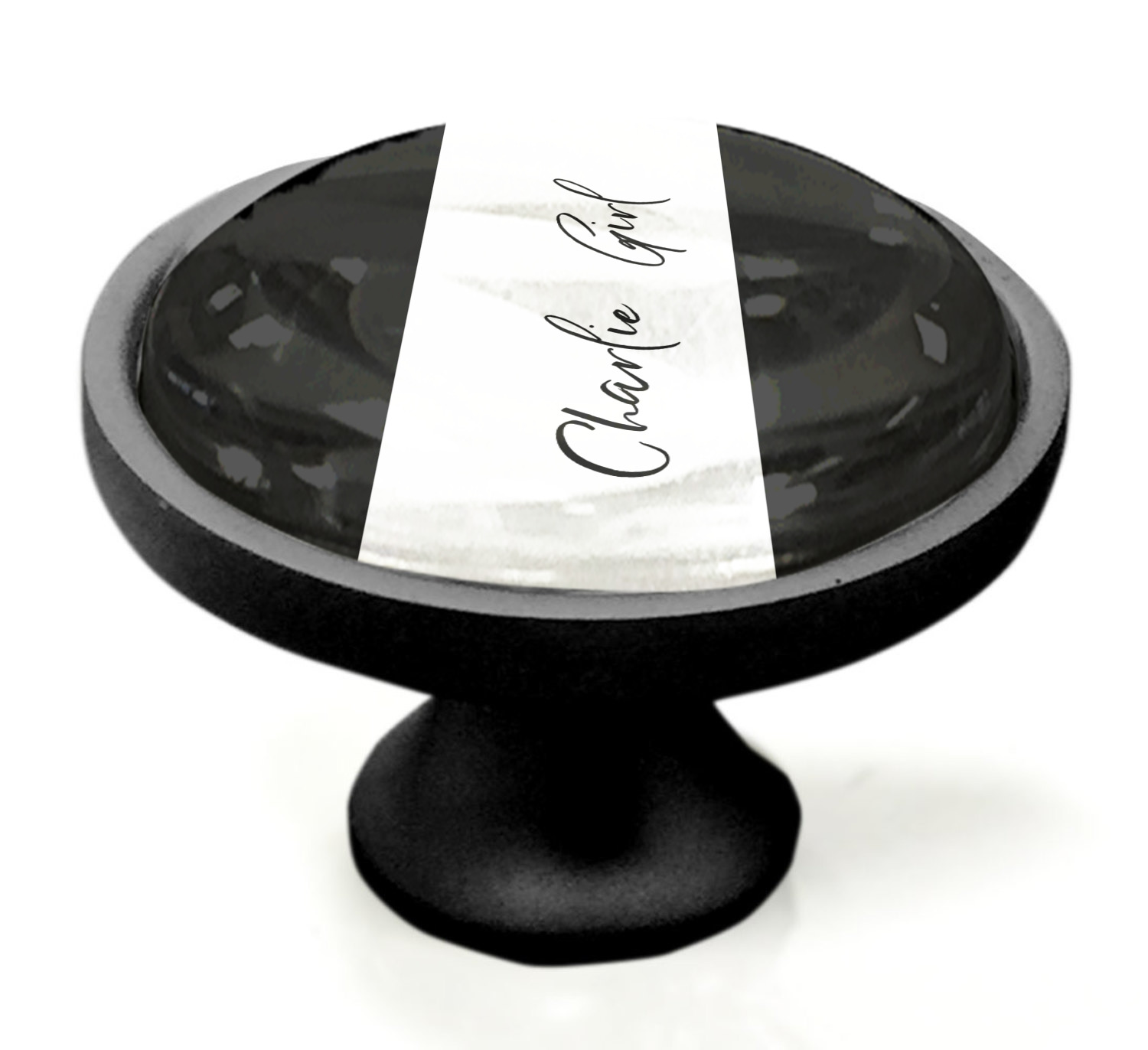 We sell these cabinet pulls in two different colors to better match your room's color scheme. We offer an oil-rubbed bronze base that is black in color, and a satin nickel option, which has a silver color. Your design is displayed across a high gloss vinyl insert that is placed on top of these cabinet handles. We then place a 1 inch thick glass cabochon atop the design, which seals the cabinet knob and makes the colors of your customization stand out. These custom cabinet knobs are approximately 1.3 inches in diameter. Your purchase includes a 1 inch screw that can be used to mount the knob to any cabinet in your home.