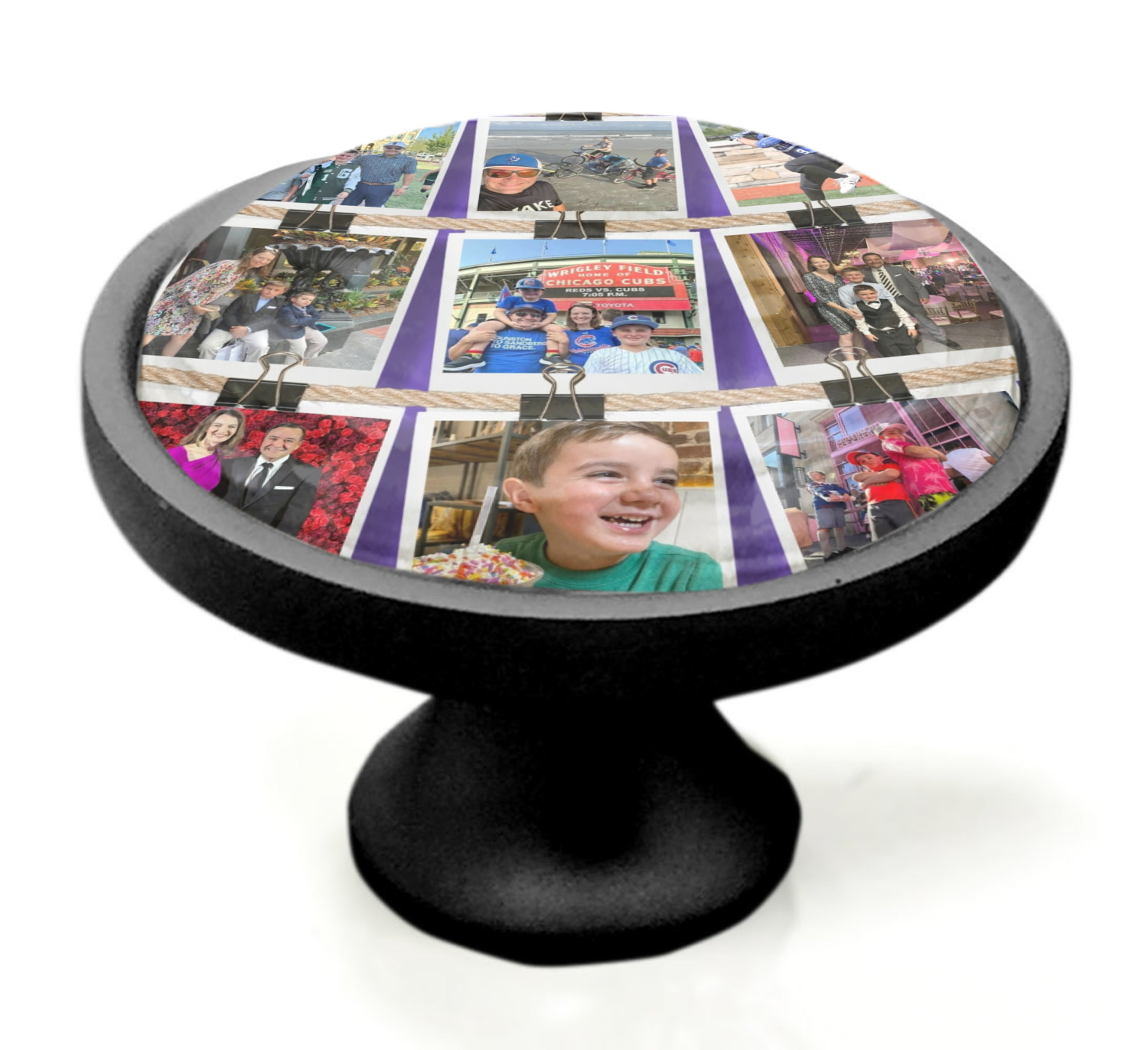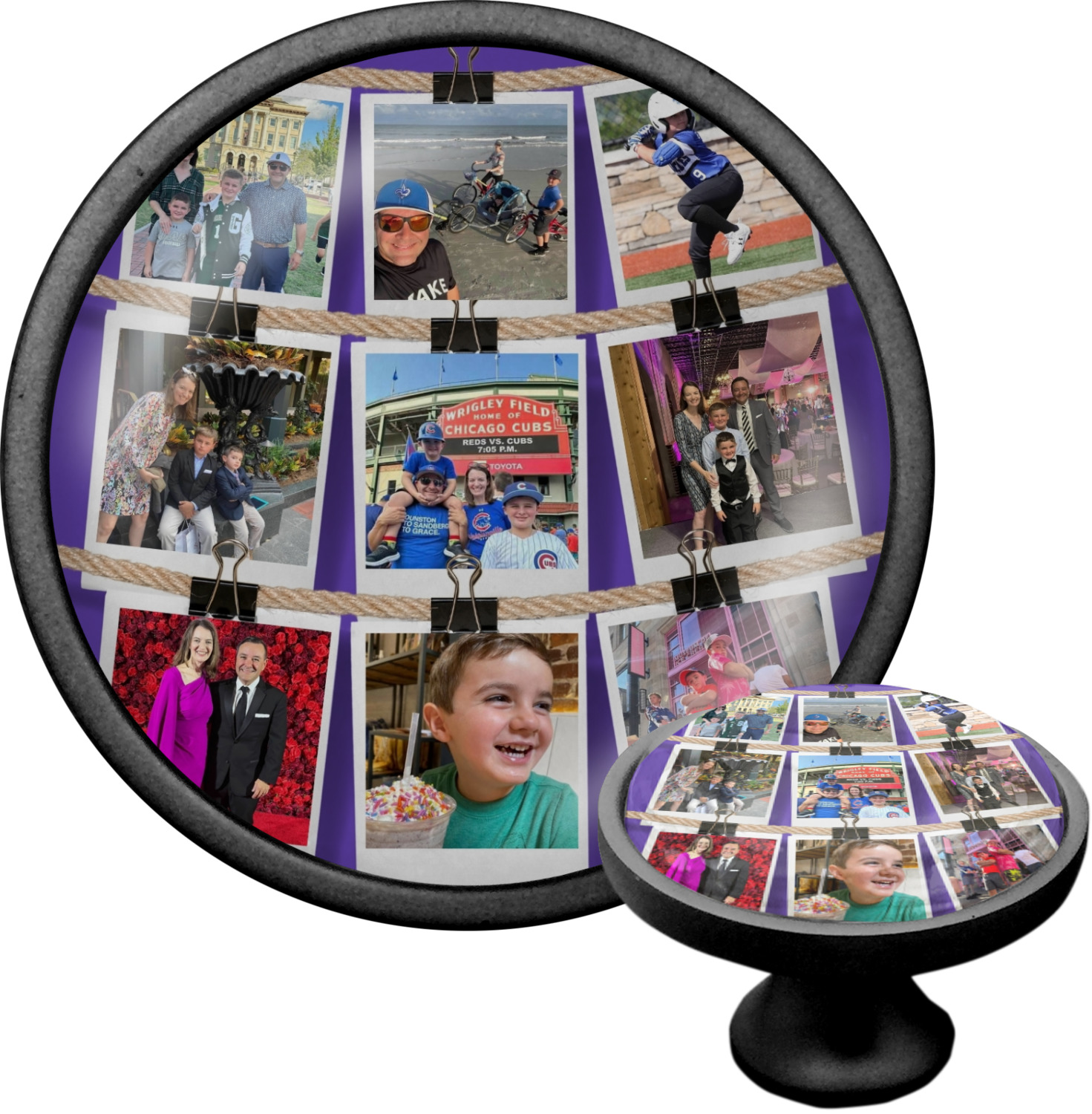 We sell these cabinet pulls in two different colors to better match your room's color scheme. We offer an oil-rubbed bronze base that is black in color, and a satin nickel option, which has a silver color. Your design is displayed across a high gloss vinyl insert that is placed on top of these cabinet handles. We then place a 1 inch thick glass cabochon atop the design, which seals the cabinet knob and makes the colors of your customization stand out. These custom cabinet knobs are approximately 1.3 inches in diameter. Your purchase includes a 1 inch screw that can be used to mount the knob to any cabinet in your home.