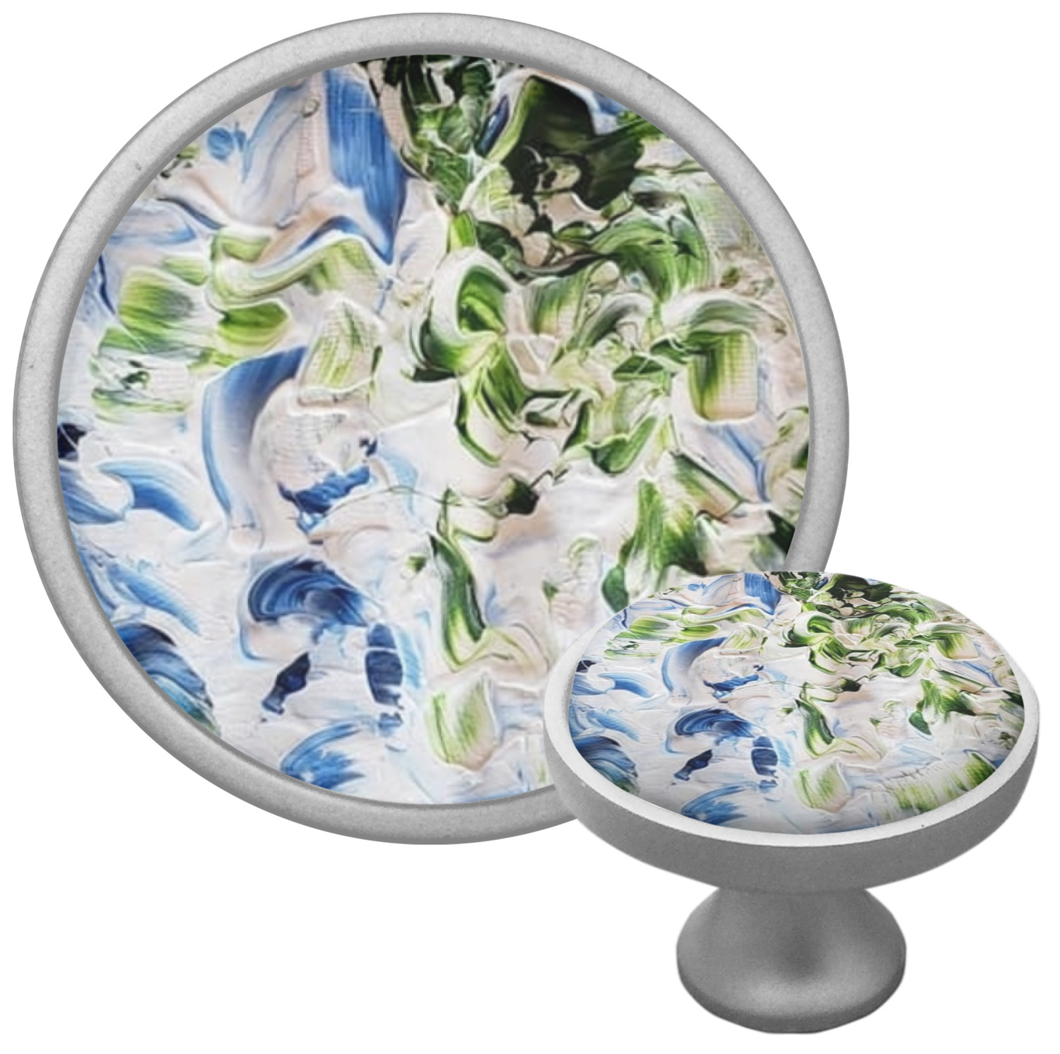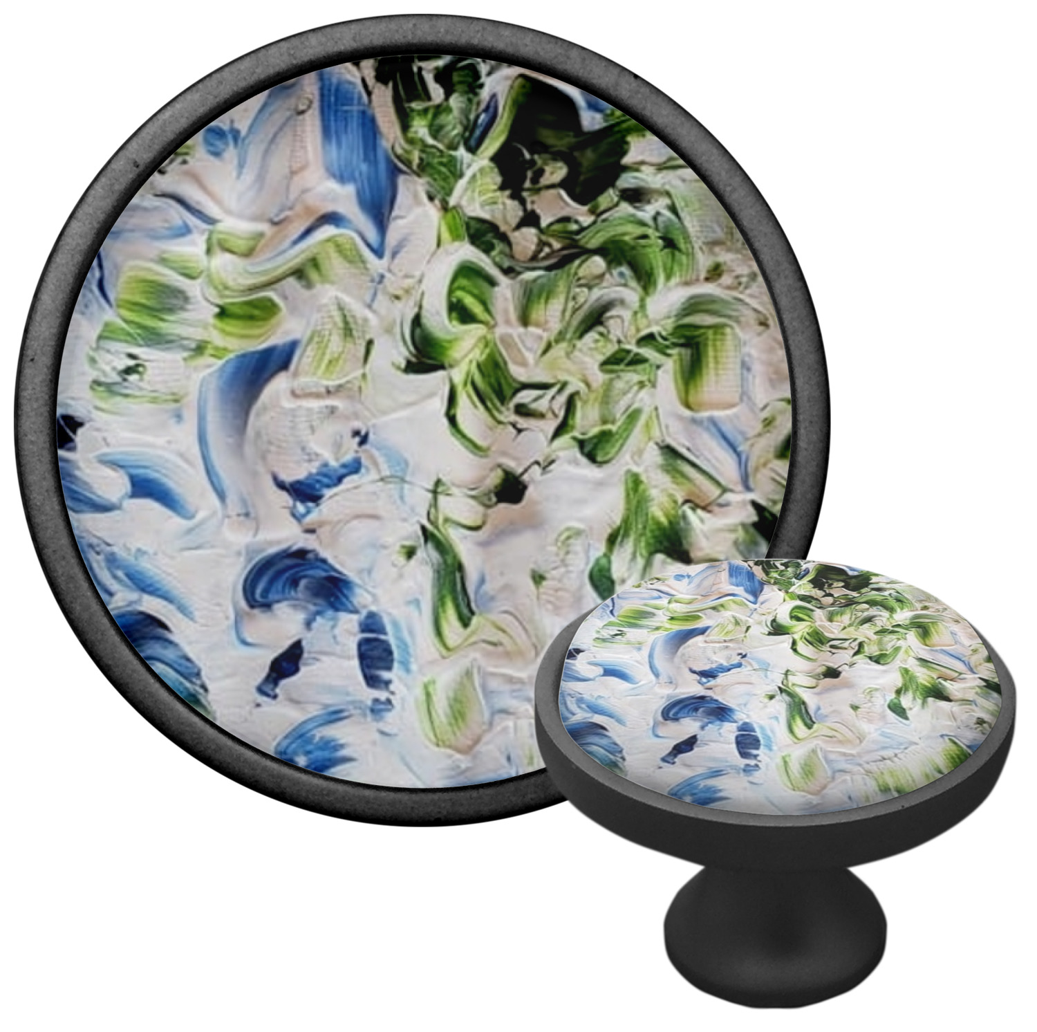 We sell these cabinet pulls in two different colors to better match your room's color scheme. We offer an oil-rubbed bronze base that is black in color, and a satin nickel option, which has a silver color. Your design is displayed across a high gloss vinyl insert that is placed on top of these cabinet handles. We then place a 1 inch thick glass cabochon atop the design, which seals the cabinet knob and makes the colors of your customization stand out. These custom cabinet knobs are approximately 1.3 inches in diameter. Your purchase includes a 1 inch screw that can be used to mount the knob to any cabinet in your home.