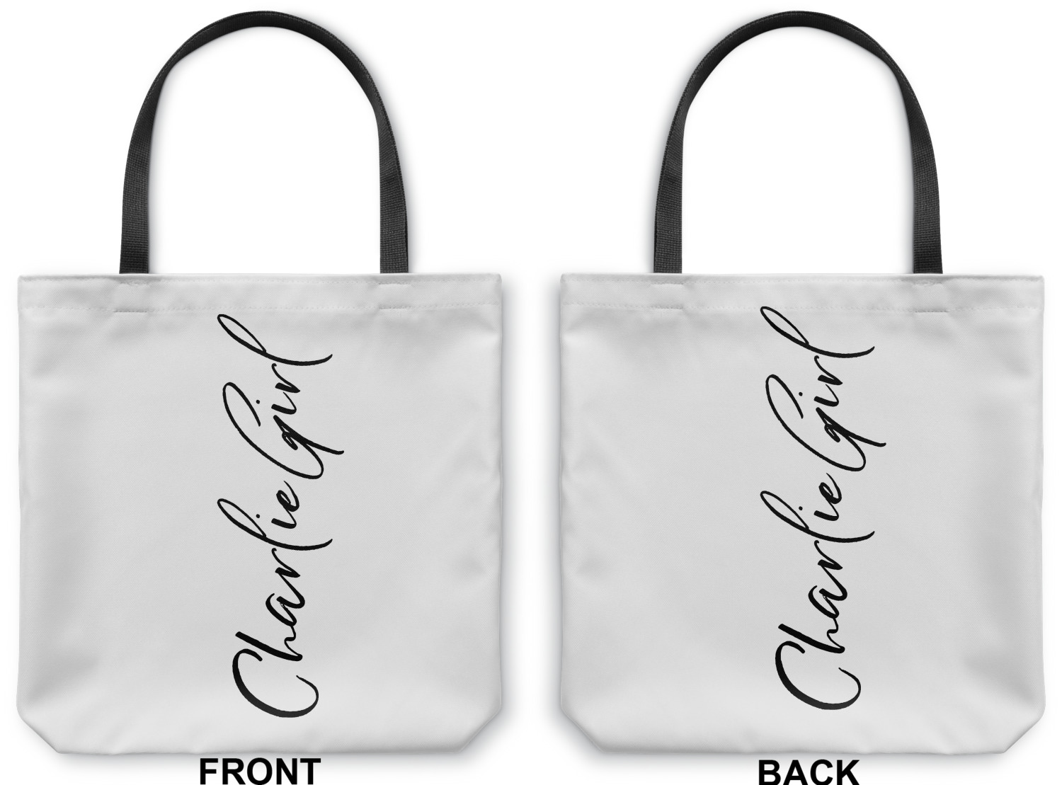 Our totes are made right here in the USA. Your design is printed on canvas fabric; the fabric is then cut and sewn on the sides and on the bottom to add an approximately 3.5 inch gusset. Black cotton handles are sewn in and reinforced. Your tote has a designs on both sides - the designs can be the same or different - the choice is yours. The inside of the tote has a black fused lining.