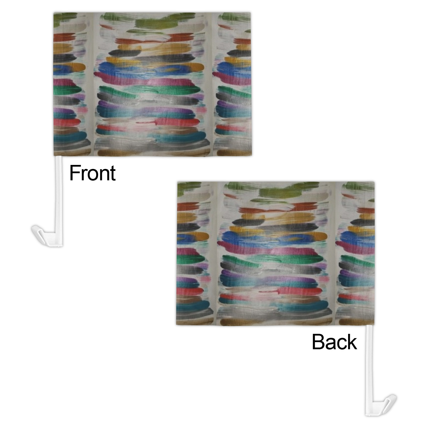 Our personalized flags are made from a durable, yet lightweight cloth that will proudly bear your logo or design of choice, while withstanding the outside elements. We have two size options - 8" x 11" and 11" x 15". Both come with a flag pole which includes a clip that secures the pole to the side window, whether it is rolled up or down. The flags are printed on both sides to display your design from all directions.