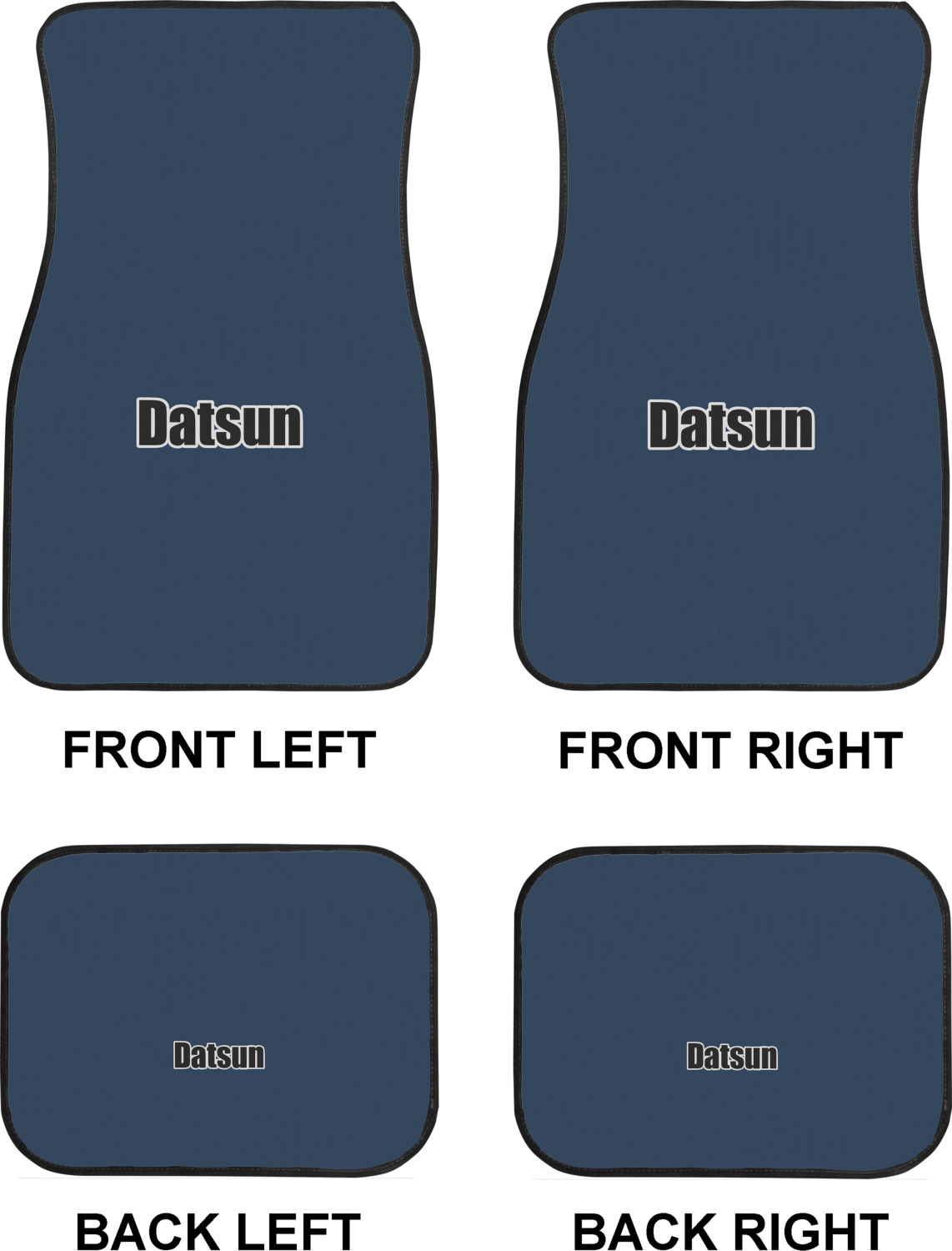 We craft our auto floor mats mats from polyester, apply a black finish to the edges, and lined at the bottom to prevent slippage. These mats protect your floors from grass, mud, and any accidental spills. We display your personalized design on the front face of each mat. The sizes of these car floor liners are standardized to provide a versatile fit for all vehicles. The front rows car mats measure at 17 by 26.5 inches, while the back rows measure at 17 by 13 inches. We sell three packages of car floor mats. You can purchase a pair of front row car mats, a pair of back row car mats, or a set of front row and back row car mats. To make an informed purchase, we recommend measuring the surface area of your car floors.