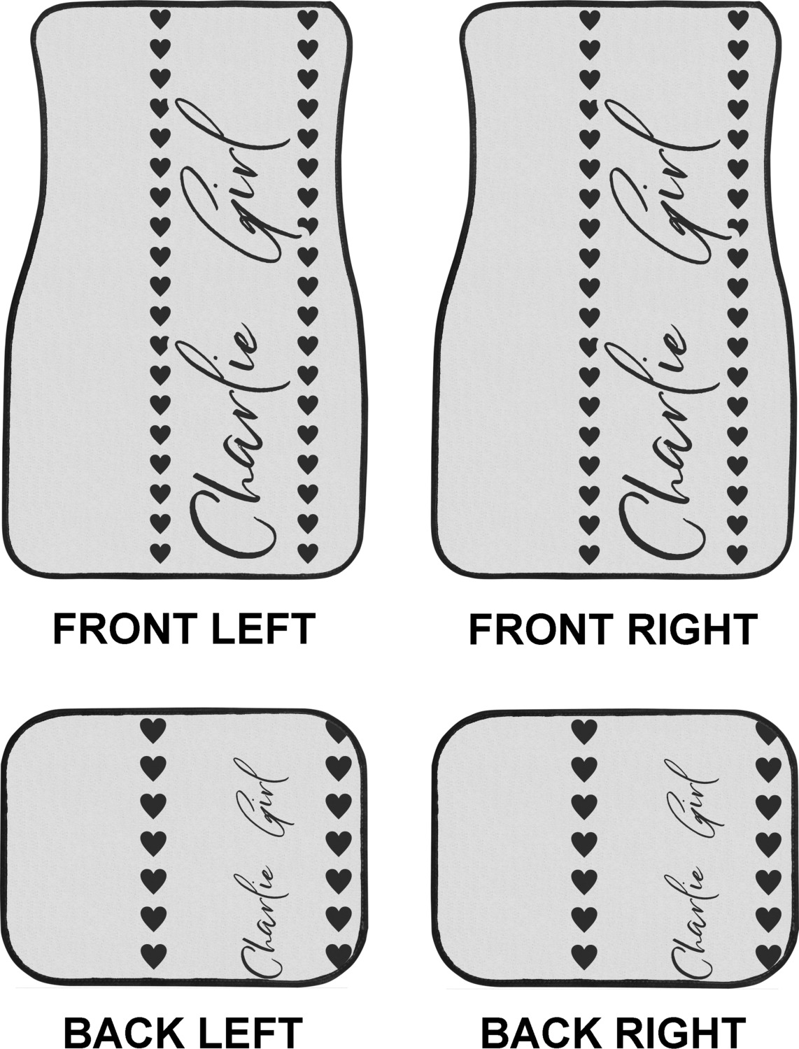 We craft our auto floor mats mats from polyester, apply a black finish to the edges, and lined at the bottom to prevent slippage. These mats protect your floors from grass, mud, and any accidental spills. We display your personalized design on the front face of each mat. The sizes of these car floor liners are standardized to provide a versatile fit for all vehicles. The front rows car mats measure at 17 by 26.5 inches, while the back rows measure at 17 by 13 inches. We sell three packages of car floor mats. You can purchase a pair of front row car mats, a pair of back row car mats, or a set of front row and back row car mats. To make an informed purchase, we recommend measuring the surface area of your car floors.