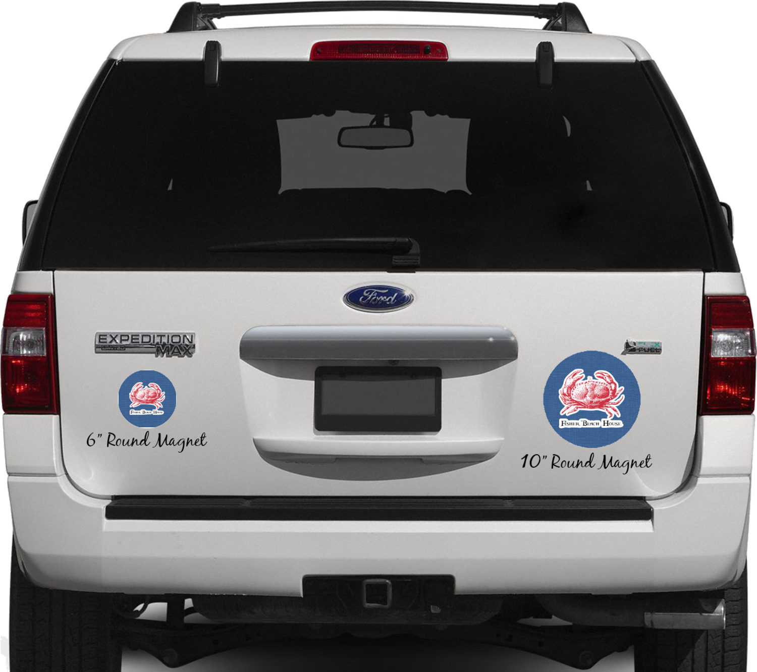 Your personalized car magnets are available for purchase in two shapes and two sizes. We carry round and square editions; each shape can either be 6 by 6 inches, or 10 by 10 inches, depending on your needs. Both versions are 1 millimeter thick, which is considered, within the industry, as the ideal thickness for automobile magnets. The magnetic car decals will adhere to any smooth, metal surface of your cars body, such as the trunk door or a side panel. However, please note that some vehicles are constructed from fiberglass bodies, which prevents the adhesion of anything magnetic. We advise that you test your vehicle before purchasing these magnets.