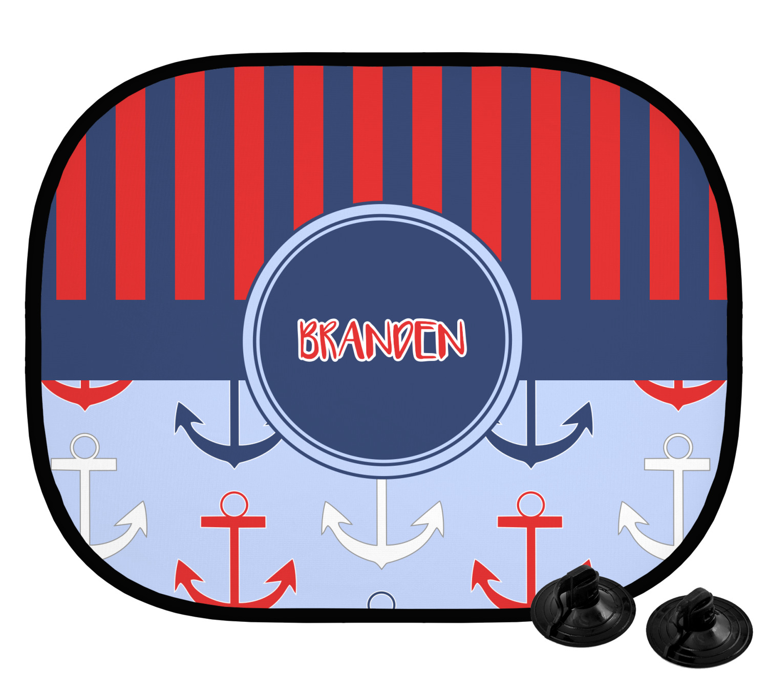 Our custom car sun shade is fabricated from a polyester netting that manages to block out most harsh rays, while still allowing some light to come through. A metal ring encircles the polyester netting, which grants durability and stiffness to the shade. We print your personalized design on the entire surface of the product. Two black suction cups accompany this product; the pair clip onto either side of the shade and allows for easy attachment and removal. Each shade measures at 17.25" x 14.25". We suggest that you measure the side windows of your car to ensure that this car window shade is a proper fit.