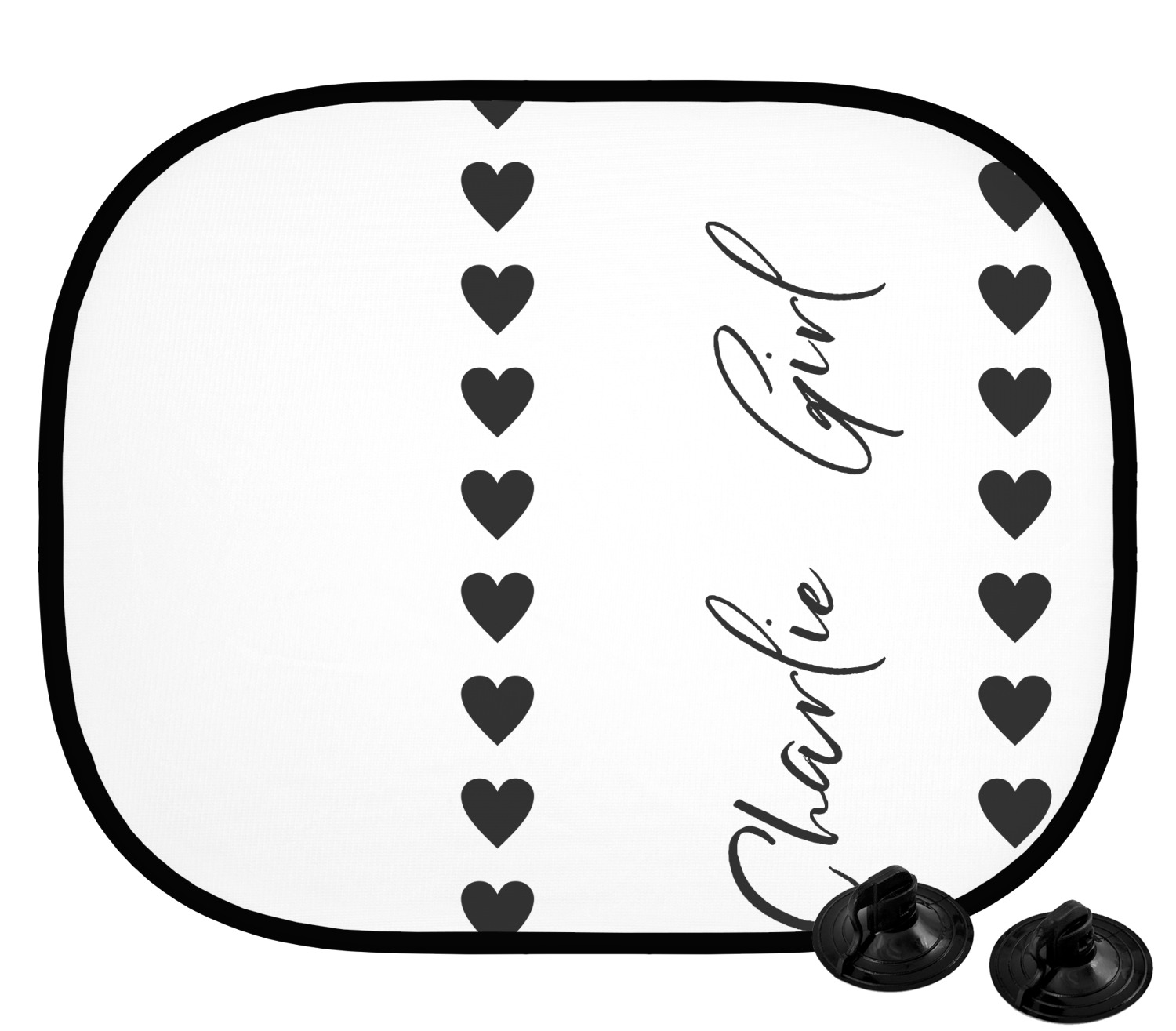 Our custom car sun shade is fabricated from a polyester netting that manages to block out most harsh rays, while still allowing some light to come through. A metal ring encircles the polyester netting, which grants durability and stiffness to the shade. We print your personalized design on the entire surface of the product. Two black suction cups accompany this product; the pair clip onto either side of the shade and allows for easy attachment and removal. Each shade measures at 17.25" x 14.25". We suggest that you measure the side windows of your car to ensure that this car window shade is a proper fit.