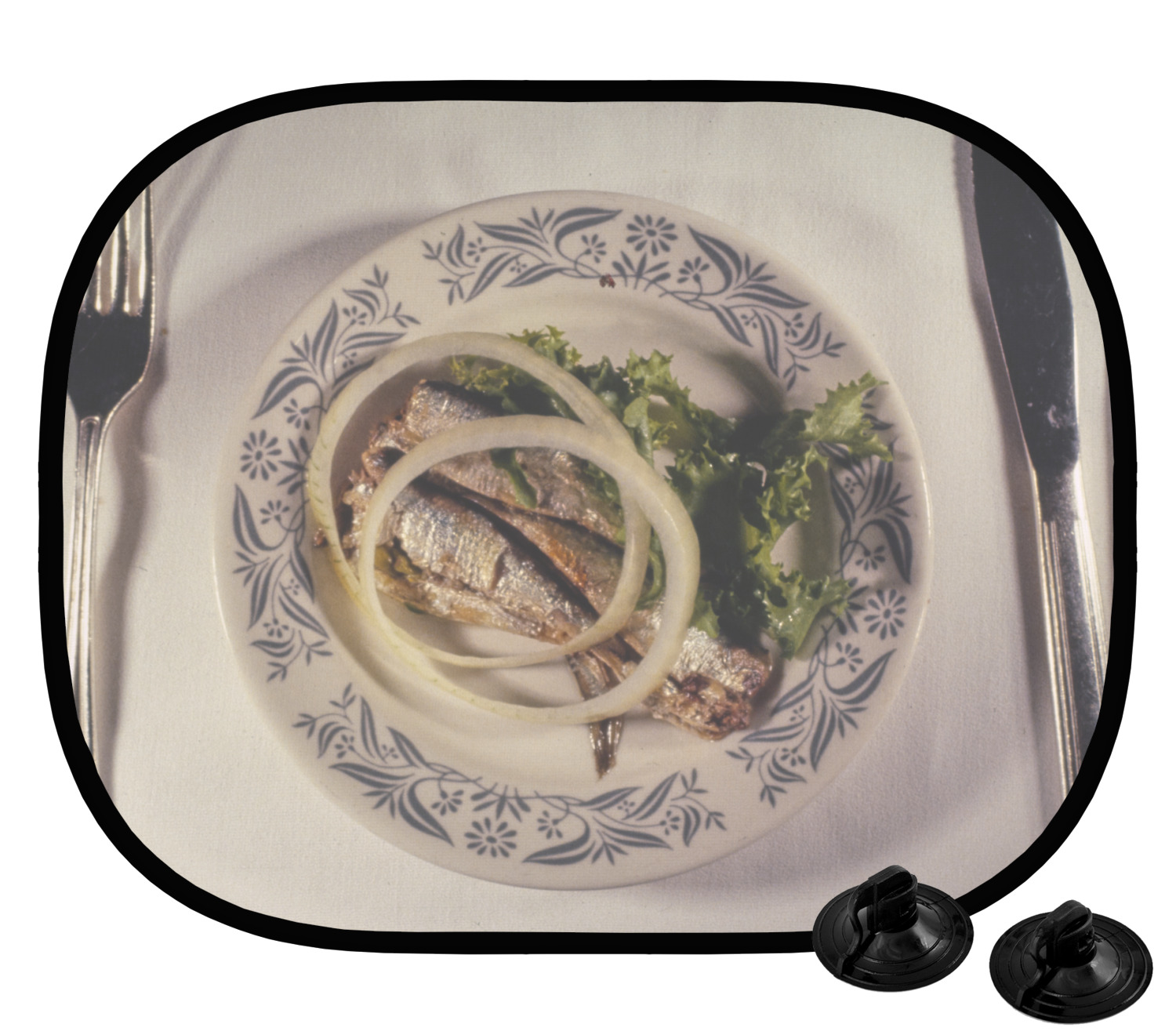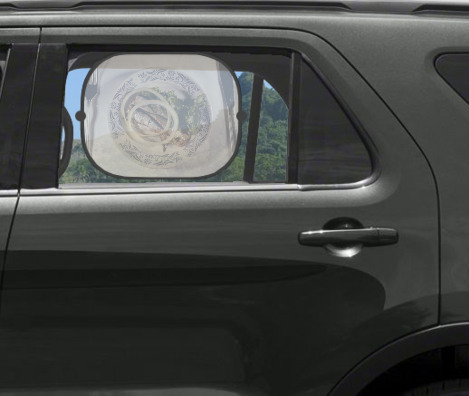 Our custom car sun shade is fabricated from a polyester netting that manages to block out most harsh rays, while still allowing some light to come through. A metal ring encircles the polyester netting, which grants durability and stiffness to the shade. We print your personalized design on the entire surface of the product. Two black suction cups accompany this product; the pair clip onto either side of the shade and allows for easy attachment and removal. Each shade measures at 17.25" x 14.25". We suggest that you measure the side windows of your car to ensure that this car window shade is a proper fit.