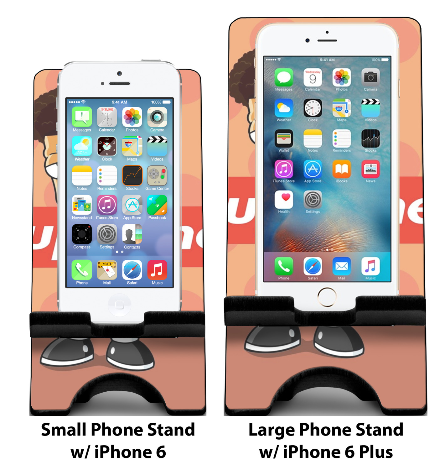 To meet your needs, we offer four variations of this IPhone stand. The backboard of the first version is shaped as a plain, yet sleek rectangle, and is available in two sizes. Our smaller size is approximately 4 by 3.25 by 7 inches, while the larger model is 4 by 3.77 by 8.5 inches. Alongside this model, we also provide you with a more decorative option. The upper part of our second version features a curved edge, for a classy, suave appearance. This phone holder is also sold in two sizes: a smaller version, which is 4 by 3.25 by 7 inches, and our larger model, which is 4 by 3.77 by 8.5 inches. Both models will support large phones, but the larger model is better if you wish to proudly display your personalized design.