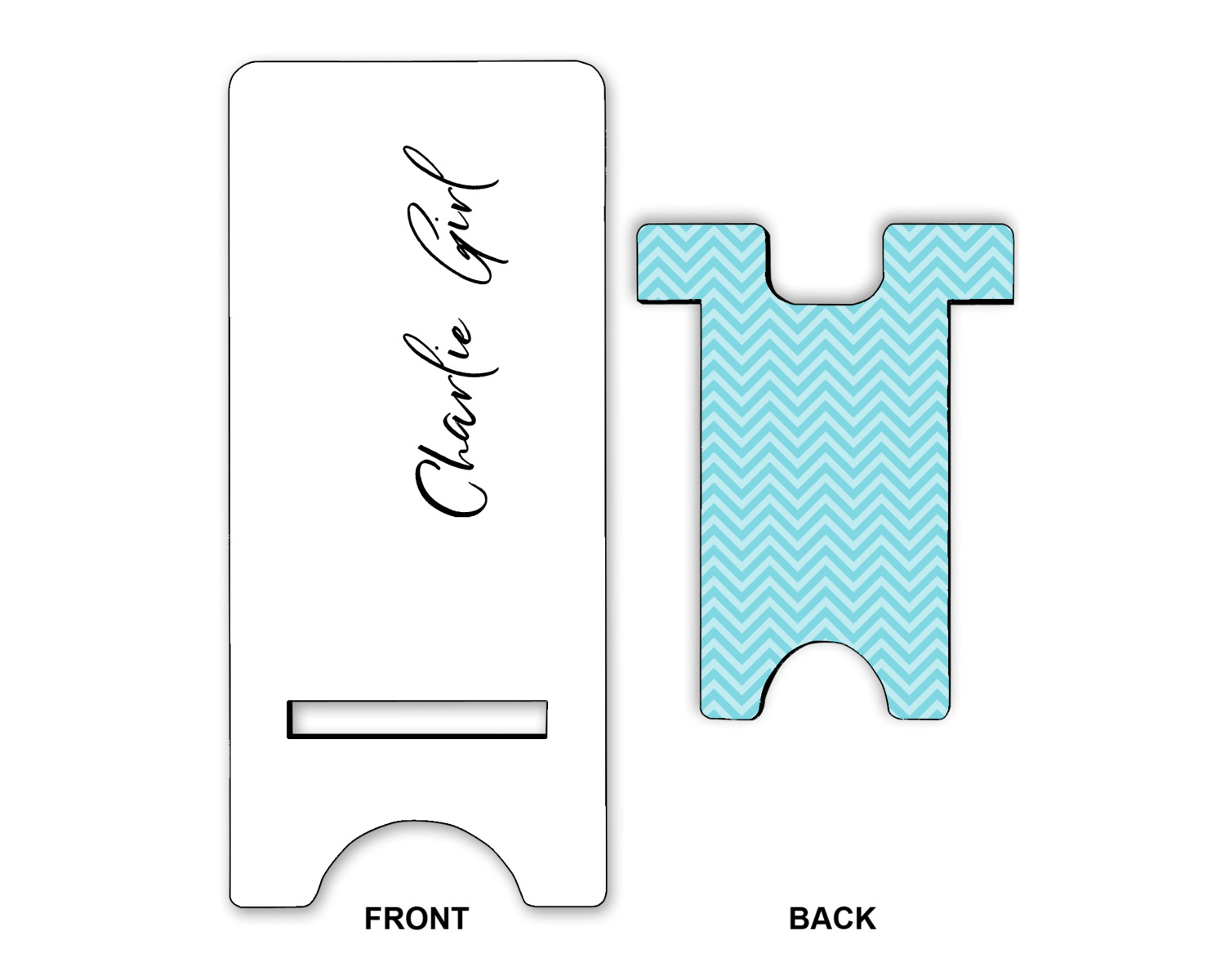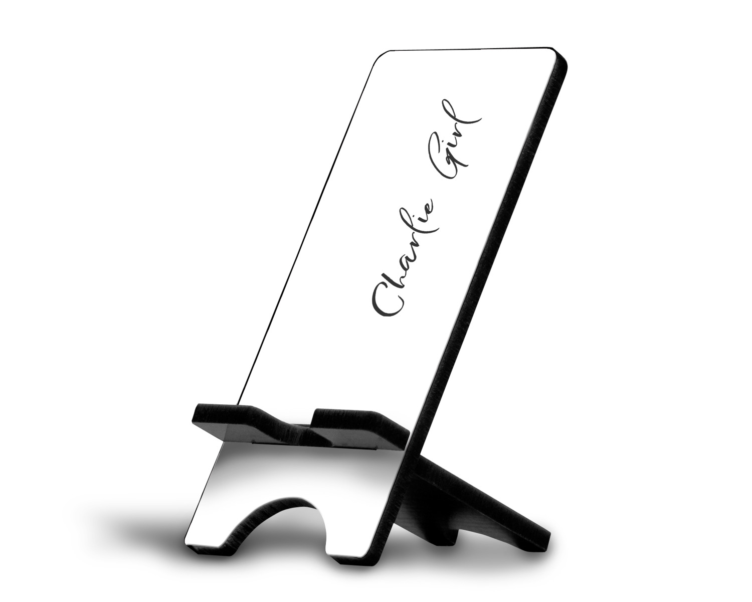 These cell phone holders are comprised of two hardboard pieces, that lock into and steady one another. The bottom part of the mobile phone stand is spacious enough to support both your phone and your charger, while it is not in use. We print your customization atop the face of this stand, while the remaining sides are a sophisticated, black color.