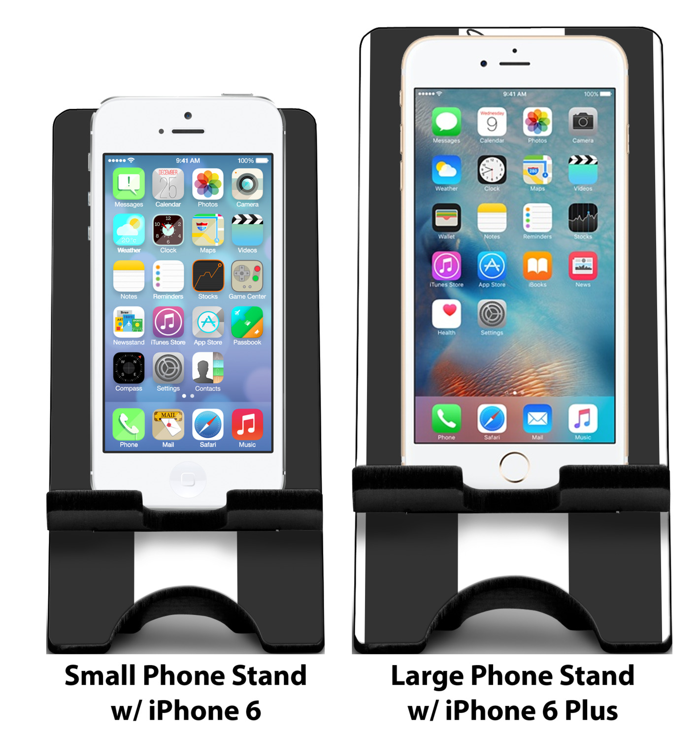 To meet your needs, we offer four variations of this IPhone stand. The backboard of the first version is shaped as a plain, yet sleek rectangle, and is available in two sizes. Our smaller size is approximately 4 by 3.25 by 7 inches, while the larger model is 4 by 3.77 by 8.5 inches. Alongside this model, we also provide you with a more decorative option. The upper part of our second version features a curved edge, for a classy, suave appearance. This phone holder is also sold in two sizes: a smaller version, which is 4 by 3.25 by 7 inches, and our larger model, which is 4 by 3.77 by 8.5 inches. Both models will support large phones, but the larger model is better if you wish to proudly display your personalized design.
