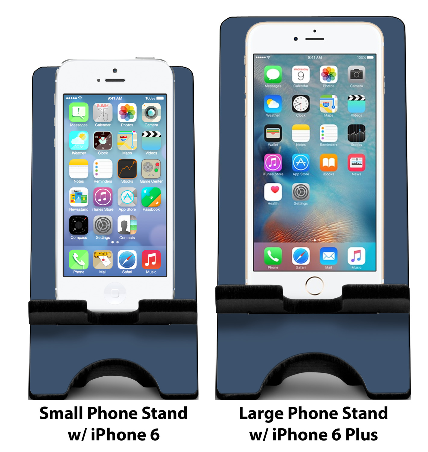 To meet your needs, we offer four variations of this IPhone stand. The backboard of the first version is shaped as a plain, yet sleek rectangle, and is available in two sizes. Our smaller size is approximately 4 by 3.25 by 7 inches, while the larger model is 4 by 3.77 by 8.5 inches. Alongside this model, we also provide you with a more decorative option. The upper part of our second version features a curved edge, for a classy, suave appearance. This phone holder is also sold in two sizes: a smaller version, which is 4 by 3.25 by 7 inches, and our larger model, which is 4 by 3.77 by 8.5 inches. Both models will support large phones, but the larger model is better if you wish to proudly display your personalized design.