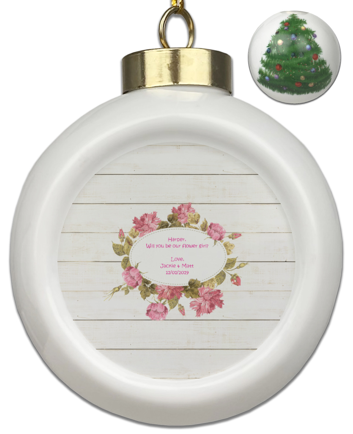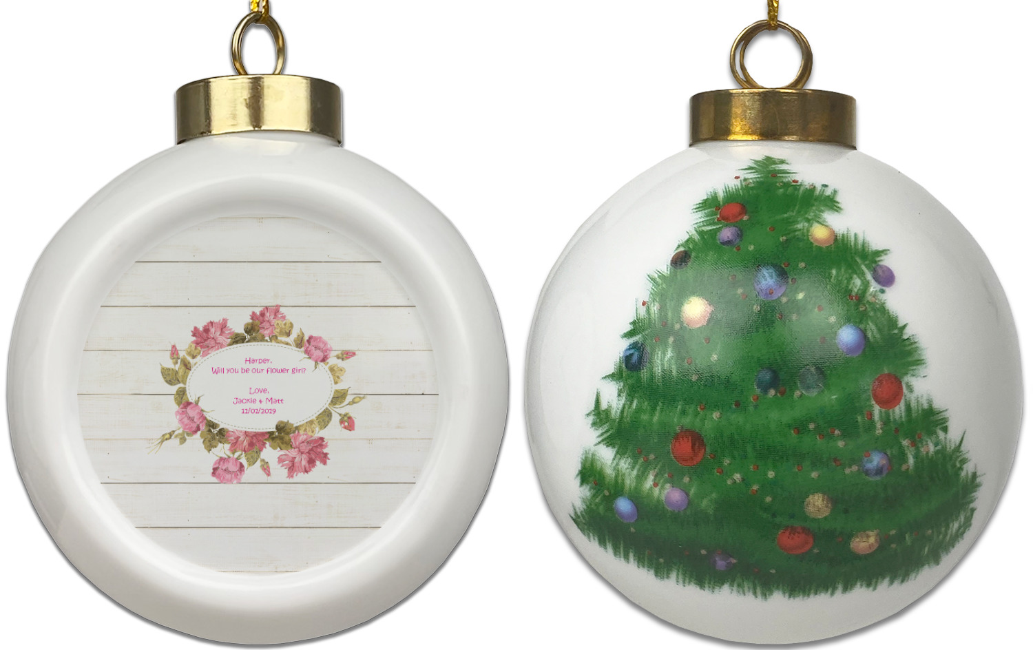 Our Christmas ornaments are a unique ceramic ball shape with a twist as it has a flat face to display your custom design! Select from one of our two design types - Christmas Tree or Poinsettia Garland - to adorn the curved back of your personal design. Each ornament measures 3H x 2.5W x 2D accompanied with a gold string accent for finishing touches to hang on your beautiful Christmas tree!