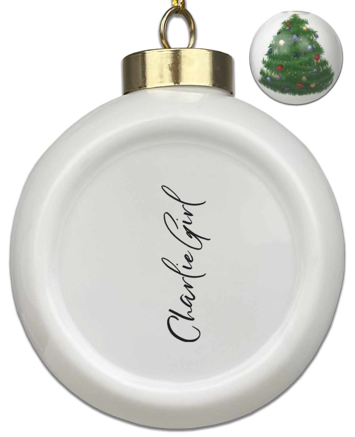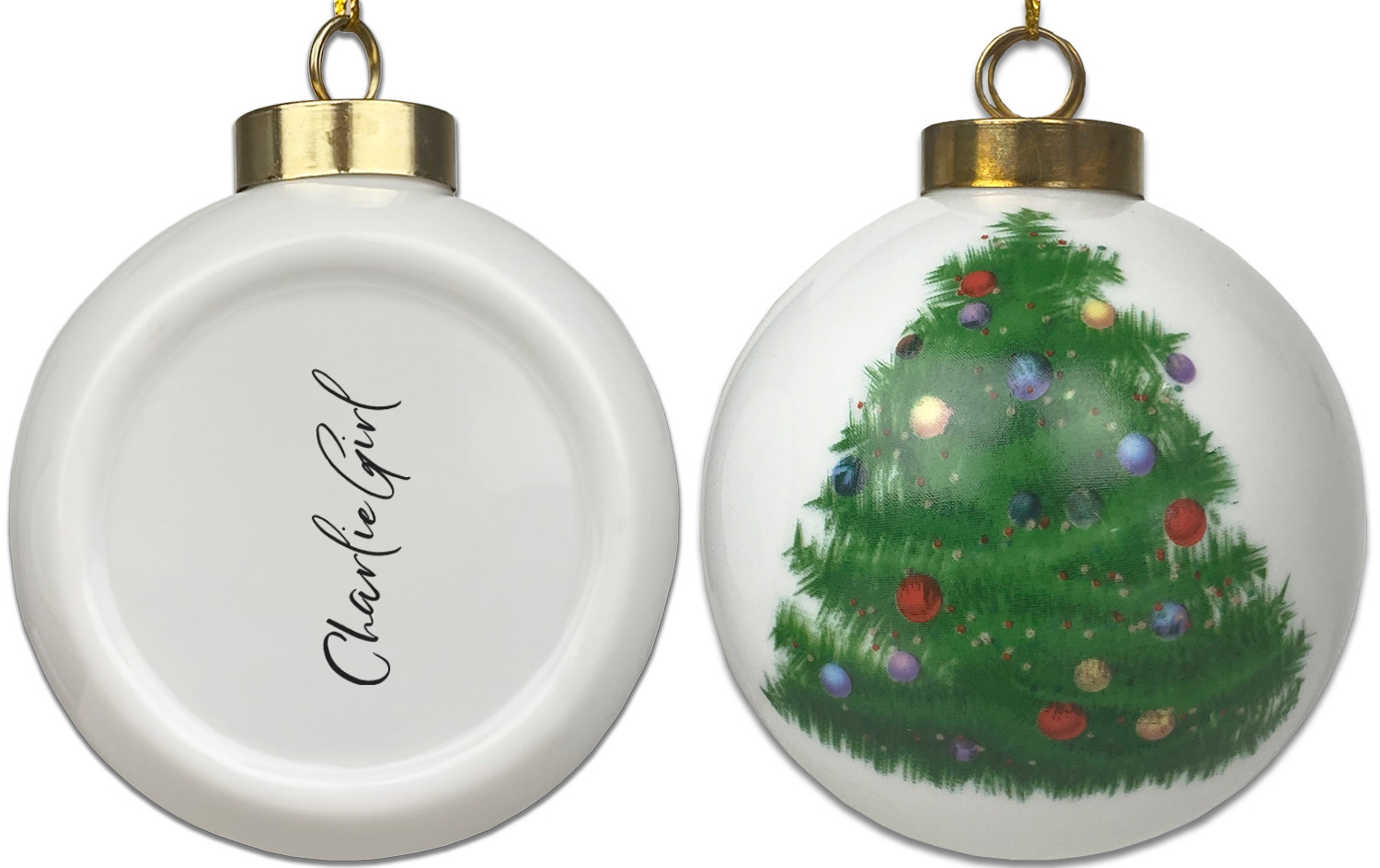 Our Christmas ornaments are a unique ceramic ball shape with a twist as it has a flat face to display your custom design! Select from one of our two design types - Christmas Tree or Poinsettia Garland - to adorn the curved back of your personal design. Each ornament measures 3H x 2.5W x 2D accompanied with a gold string accent for finishing touches to hang on your beautiful Christmas tree!