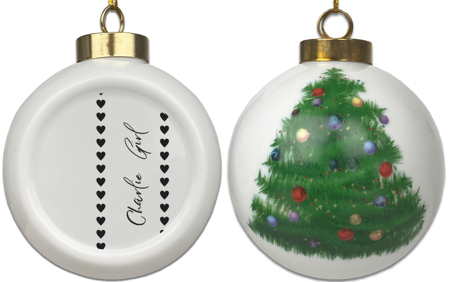 Our Christmas ornaments are a unique ceramic ball shape with a twist as it has a flat face to display your custom design! Select from one of our two design types - Christmas Tree or Poinsettia Garland - to adorn the curved back of your personal design. Each ornament measures 3H x 2.5W x 2D accompanied with a gold string accent for finishing touches to hang on your beautiful Christmas tree!