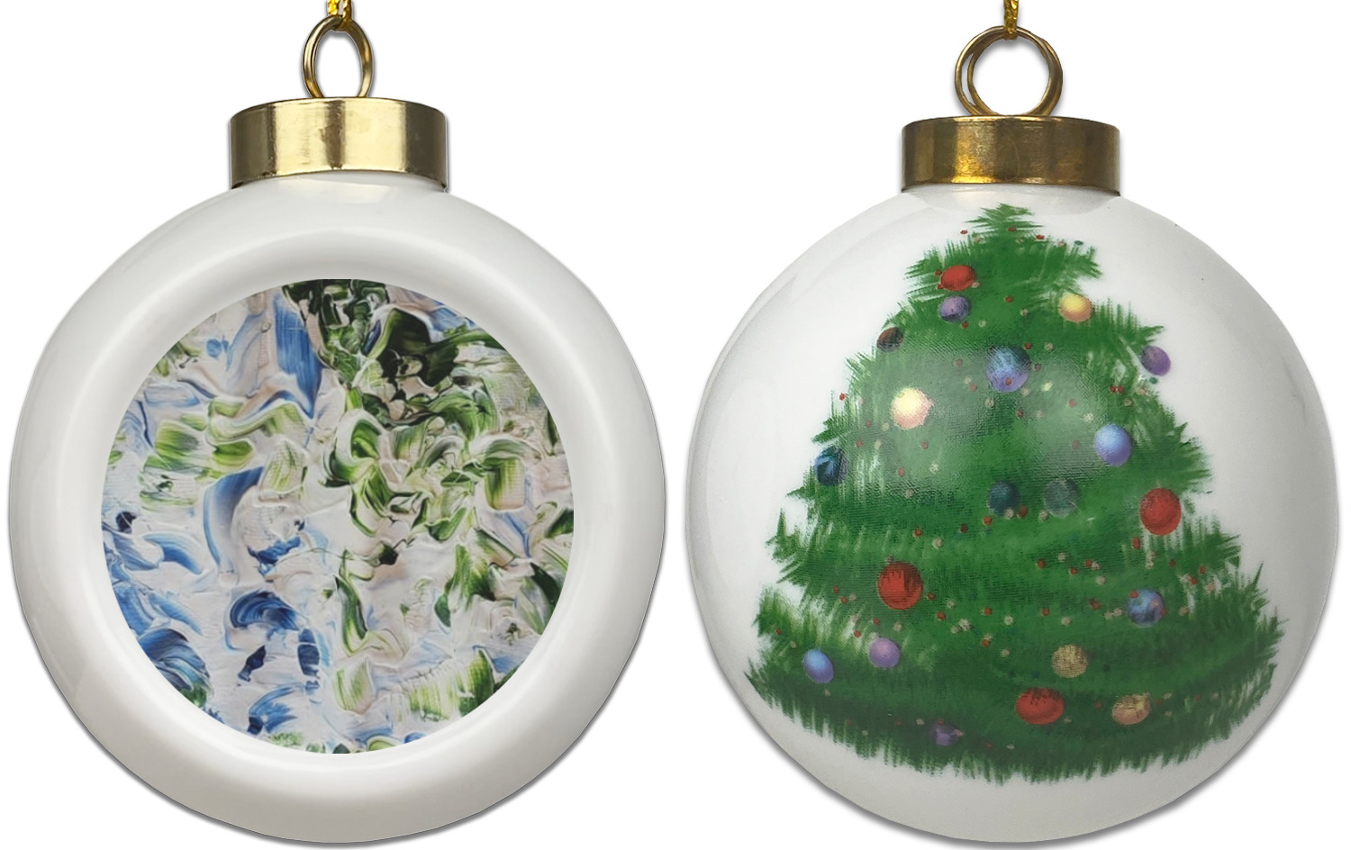 Our Christmas ornaments are a unique ceramic ball shape with a twist as it has a flat face to display your custom design! Select from one of our two design types - Christmas Tree or Poinsettia Garland - to adorn the curved back of your personal design. Each ornament measures 3H x 2.5W x 2D accompanied with a gold string accent for finishing touches to hang on your beautiful Christmas tree!