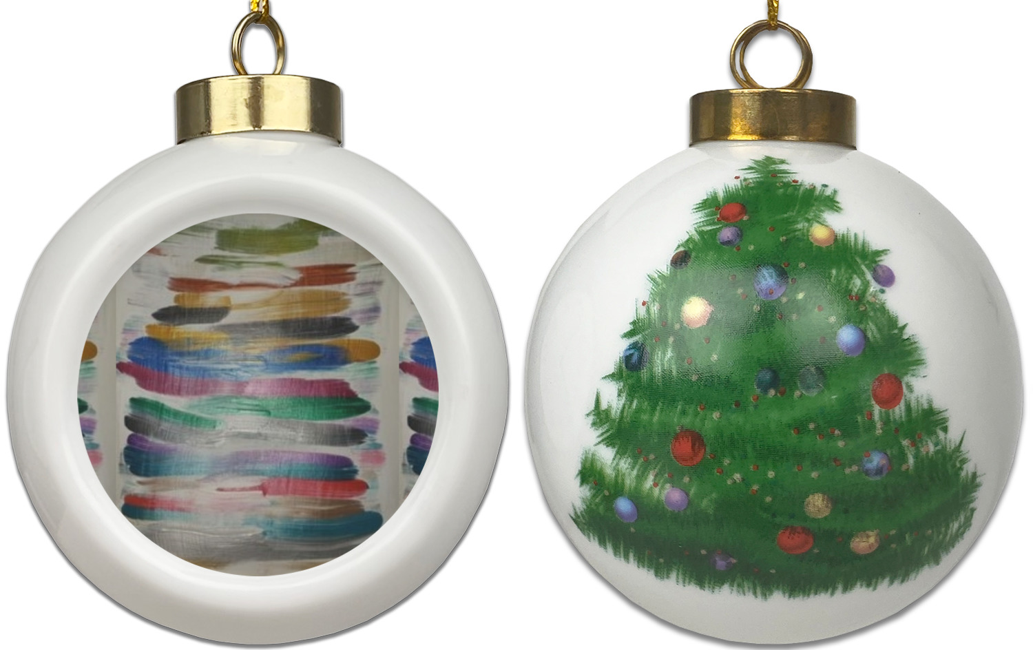 Our Christmas ornaments are a unique ceramic ball shape with a twist as it has a flat face to display your custom design! Select from one of our two design types - Christmas Tree or Poinsettia Garland - to adorn the curved back of your personal design. Each ornament measures 3H x 2.5W x 2D accompanied with a gold string accent for finishing touches to hang on your beautiful Christmas tree!