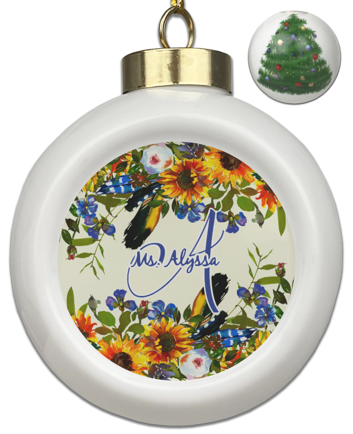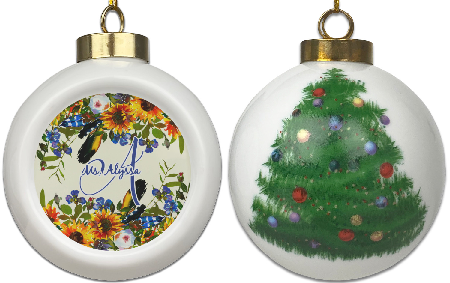 Our Christmas ornaments are a unique ceramic ball shape with a twist as it has a flat face to display your custom design! Select from one of our two design types - Christmas Tree or Poinsettia Garland - to adorn the curved back of your personal design. Each ornament measures 3H x 2.5W x 2D accompanied with a gold string accent for finishing touches to hang on your beautiful Christmas tree!