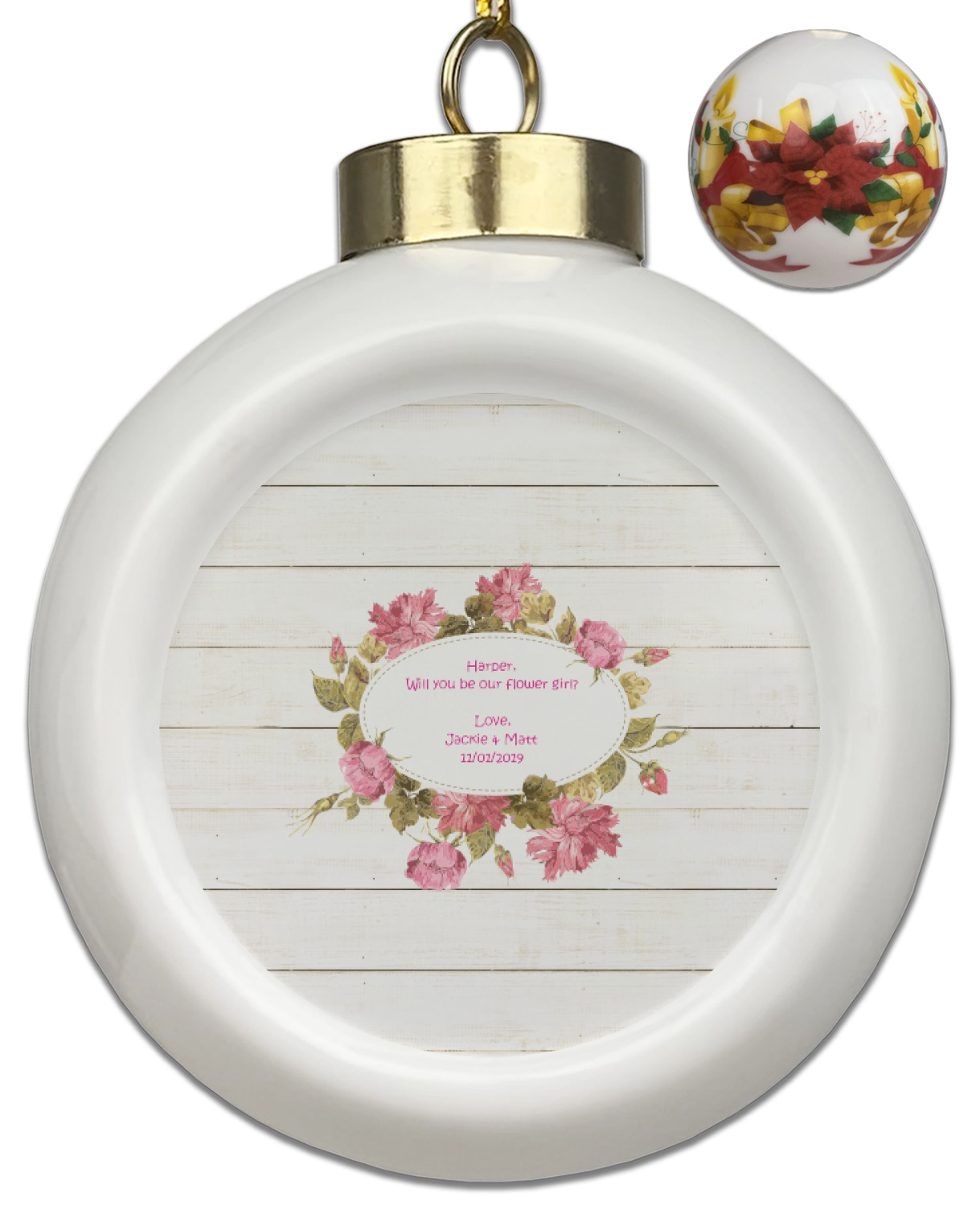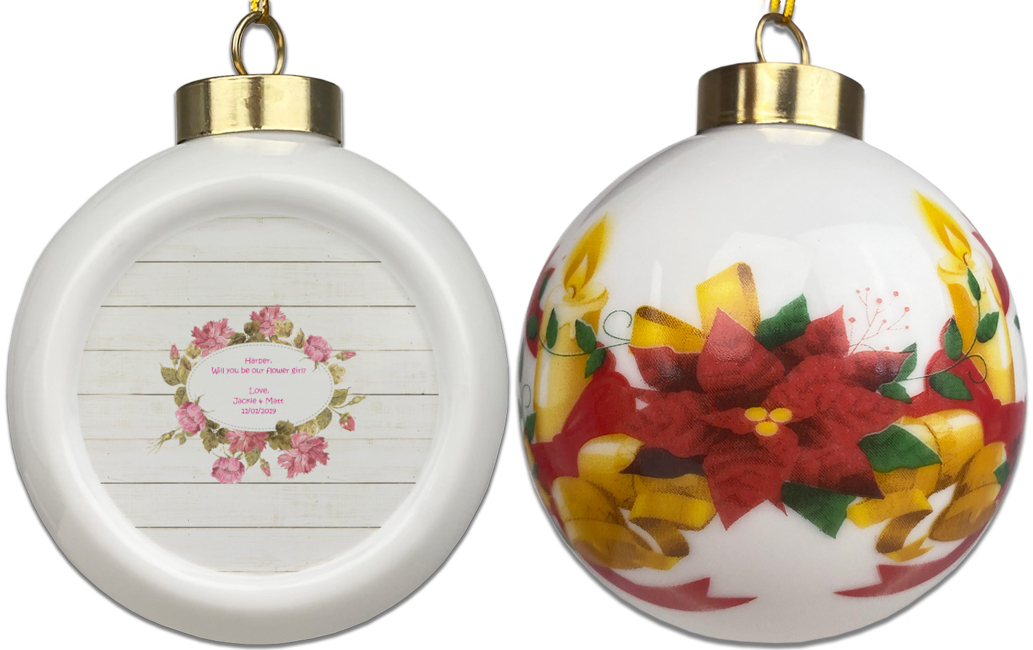 Our Christmas ornaments are a unique ceramic ball shape with a twist as it has a flat face to display your custom design! Select from one of our two design types - Christmas Tree or Poinsettia Garland - to adorn the curved back of your personal design. Each ornament measures 3H x 2.5W x 2D accompanied with a gold string accent for finishing touches to hang on your beautiful Christmas tree!