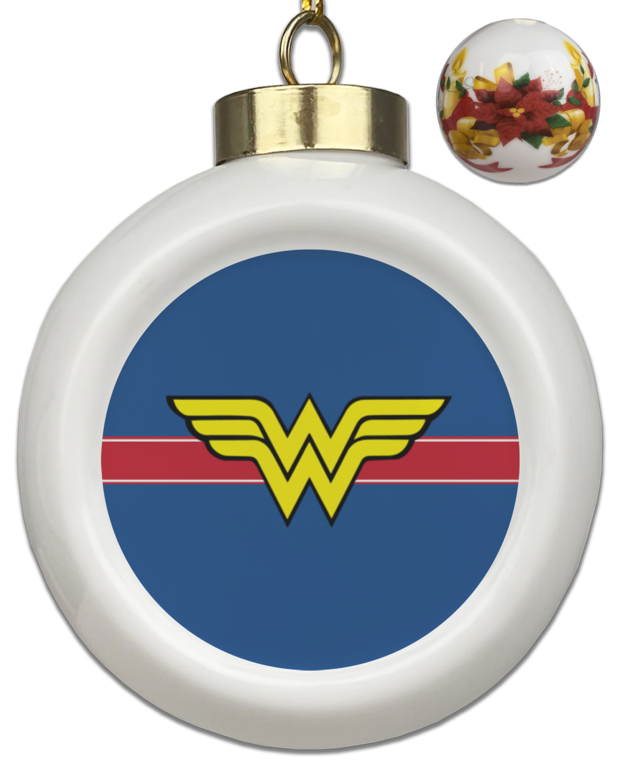 Our Christmas ornaments are a unique ceramic ball shape with a twist as it has a flat face to display your custom design! Select from one of our two design types - Christmas Tree or Poinsettia Garland - to adorn the curved back of your personal design. Each ornament measures 3H x 2.5W x 2D accompanied with a gold string accent for finishing touches to hang on your beautiful Christmas tree!