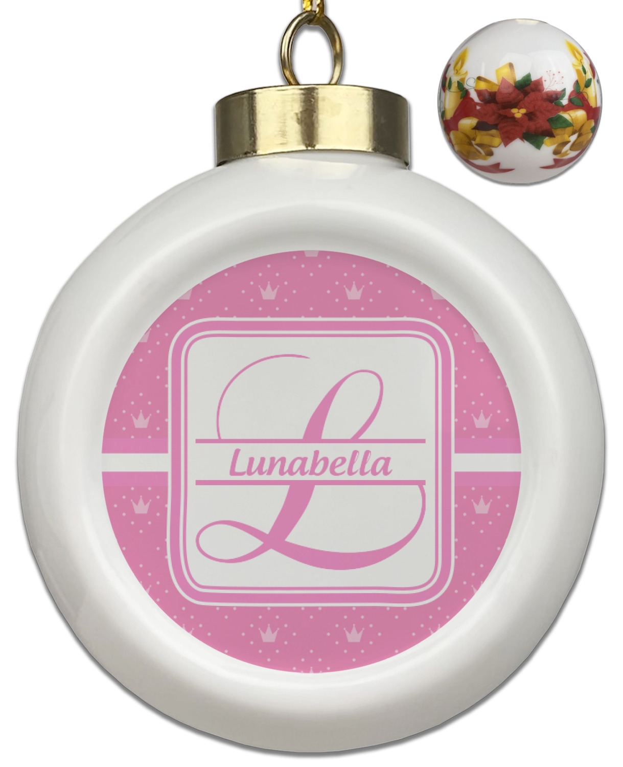 Our Christmas ornaments are a unique ceramic ball shape with a twist as it has a flat face to display your custom design! Select from one of our two design types - Christmas Tree or Poinsettia Garland - to adorn the curved back of your personal design. Each ornament measures 3H x 2.5W x 2D accompanied with a gold string accent for finishing touches to hang on your beautiful Christmas tree!