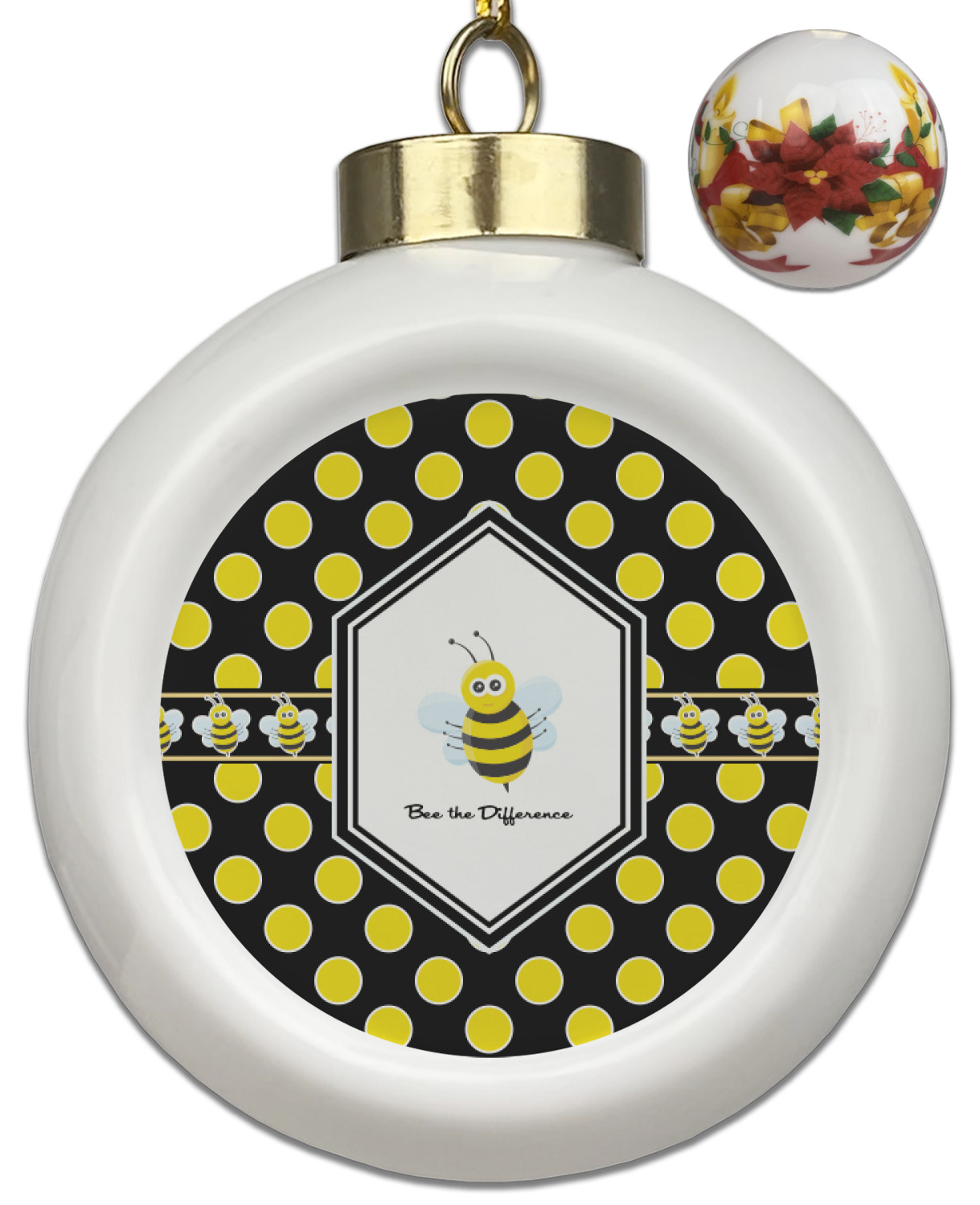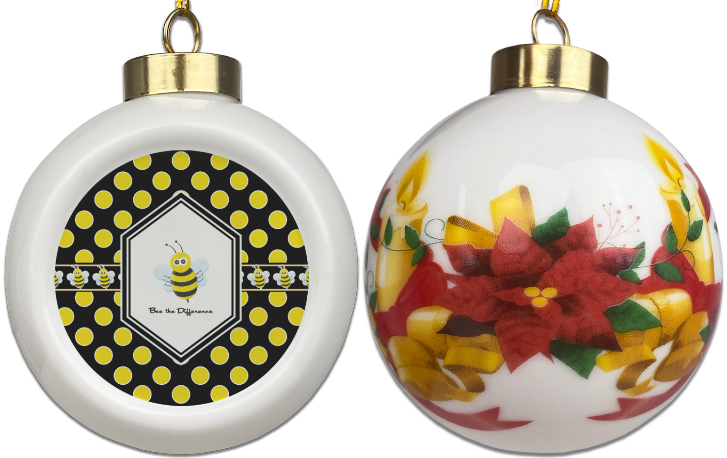 Our Christmas ornaments are a unique ceramic ball shape with a twist as it has a flat face to display your custom design! Select from one of our two design types - Christmas Tree or Poinsettia Garland - to adorn the curved back of your personal design. Each ornament measures 3H x 2.5W x 2D accompanied with a gold string accent for finishing touches to hang on your beautiful Christmas tree!