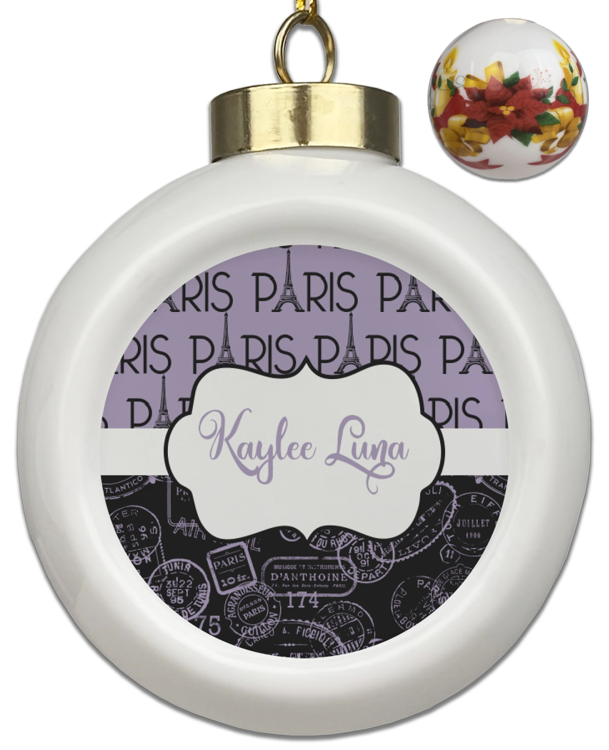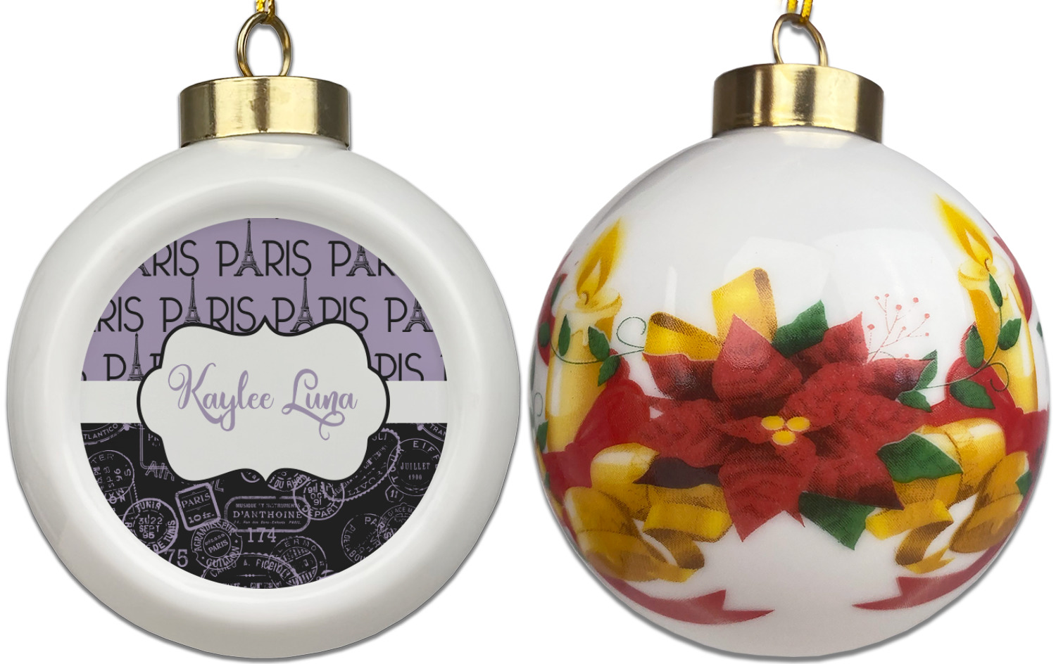Our Christmas ornaments are a unique ceramic ball shape with a twist as it has a flat face to display your custom design! Select from one of our two design types - Christmas Tree or Poinsettia Garland - to adorn the curved back of your personal design. Each ornament measures 3H x 2.5W x 2D accompanied with a gold string accent for finishing touches to hang on your beautiful Christmas tree!