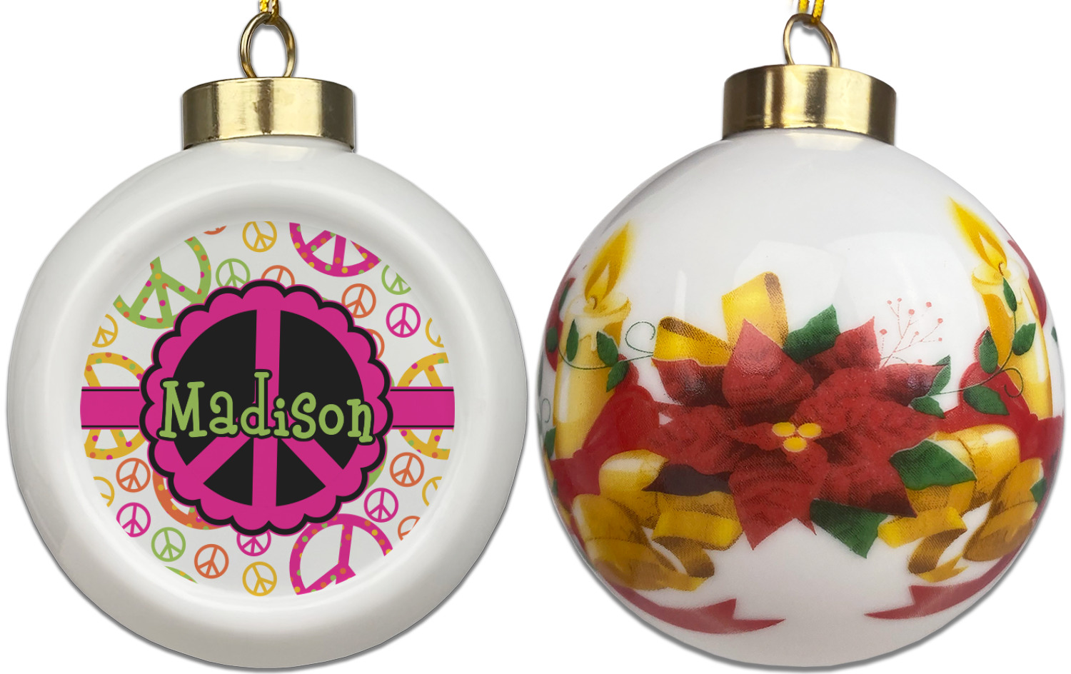 Our Christmas ornaments are a unique ceramic ball shape with a twist as it has a flat face to display your custom design! Select from one of our two design types - Christmas Tree or Poinsettia Garland - to adorn the curved back of your personal design. Each ornament measures 3H x 2.5W x 2D accompanied with a gold string accent for finishing touches to hang on your beautiful Christmas tree!
