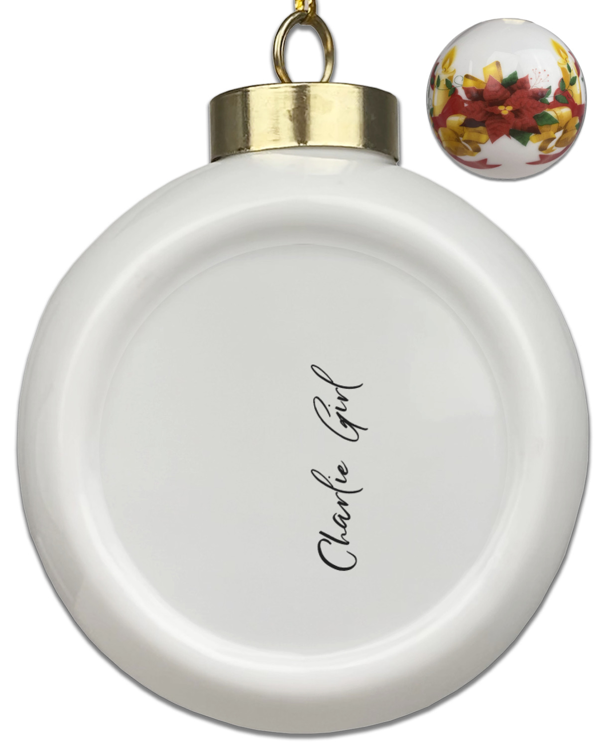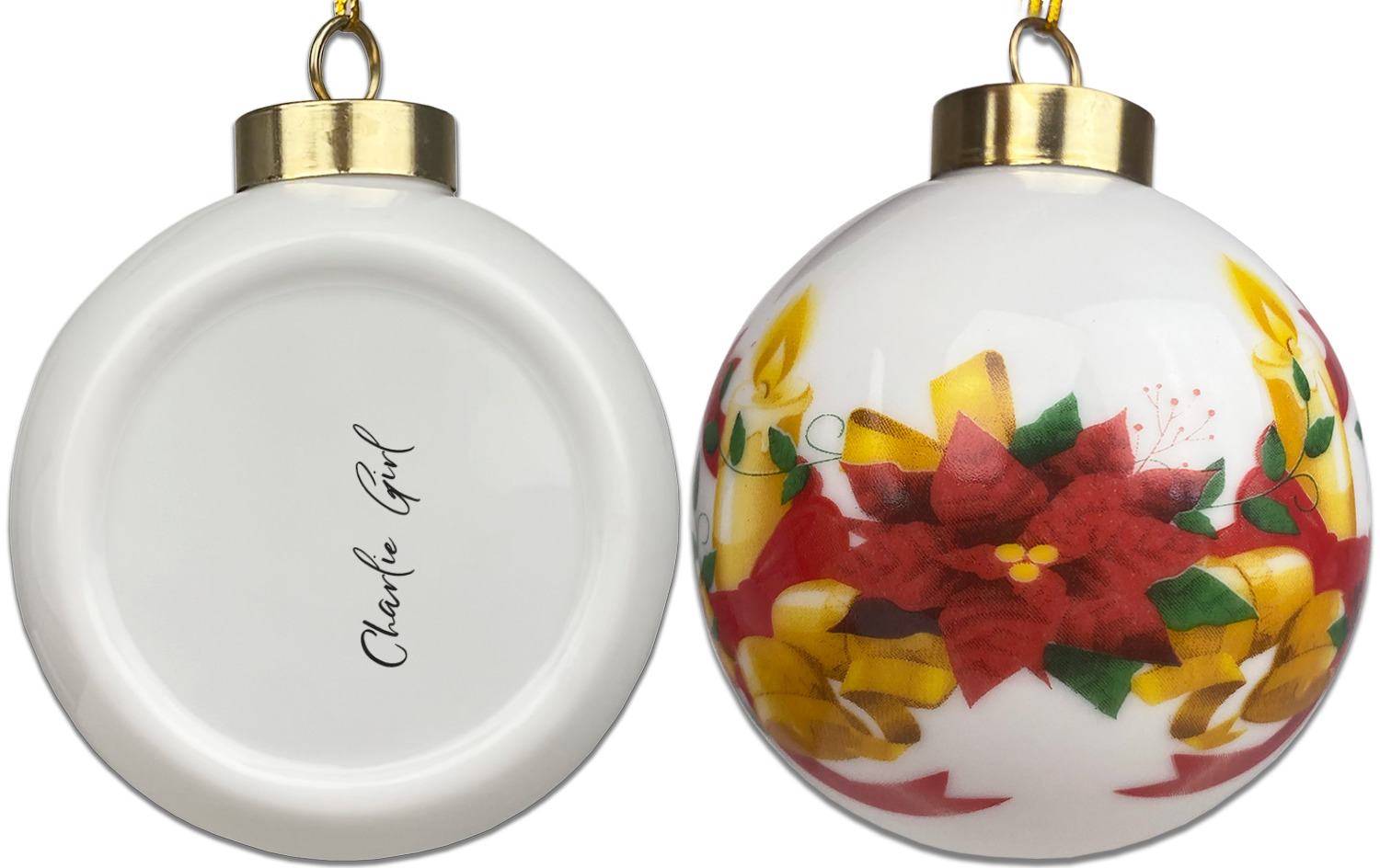 Our Christmas ornaments are a unique ceramic ball shape with a twist as it has a flat face to display your custom design! Select from one of our two design types - Christmas Tree or Poinsettia Garland - to adorn the curved back of your personal design. Each ornament measures 3H x 2.5W x 2D accompanied with a gold string accent for finishing touches to hang on your beautiful Christmas tree!