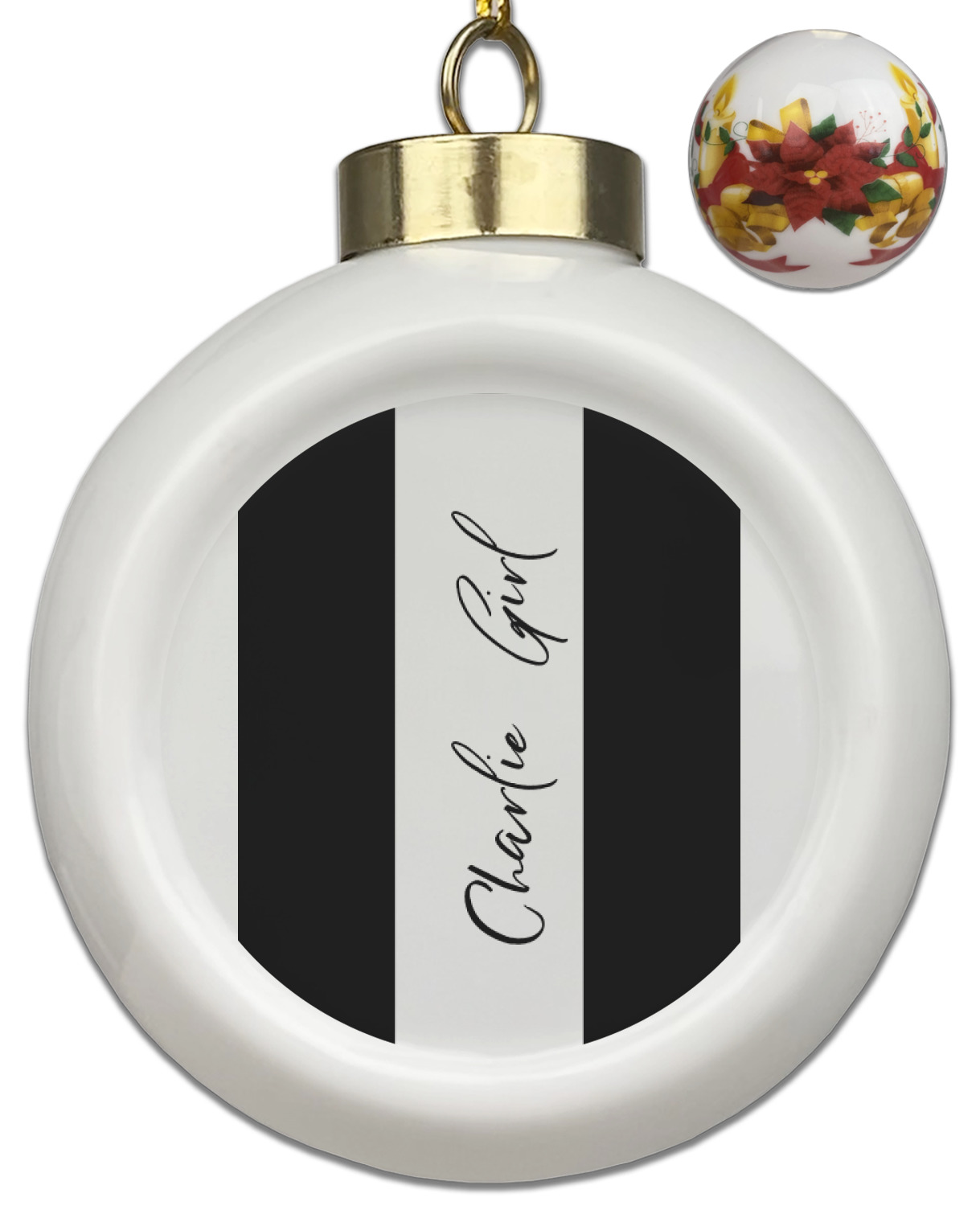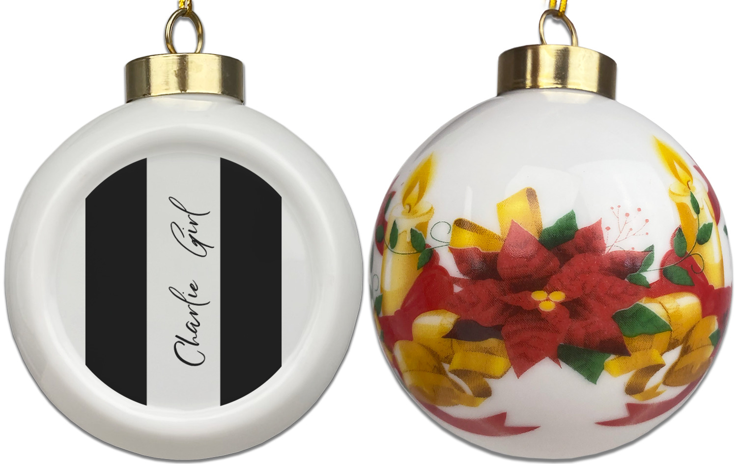 Our Christmas ornaments are a unique ceramic ball shape with a twist as it has a flat face to display your custom design! Select from one of our two design types - Christmas Tree or Poinsettia Garland - to adorn the curved back of your personal design. Each ornament measures 3H x 2.5W x 2D accompanied with a gold string accent for finishing touches to hang on your beautiful Christmas tree!