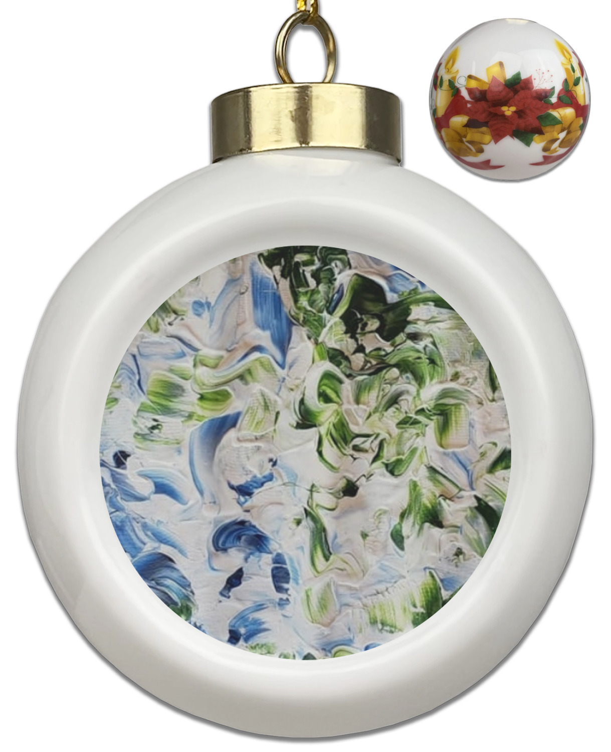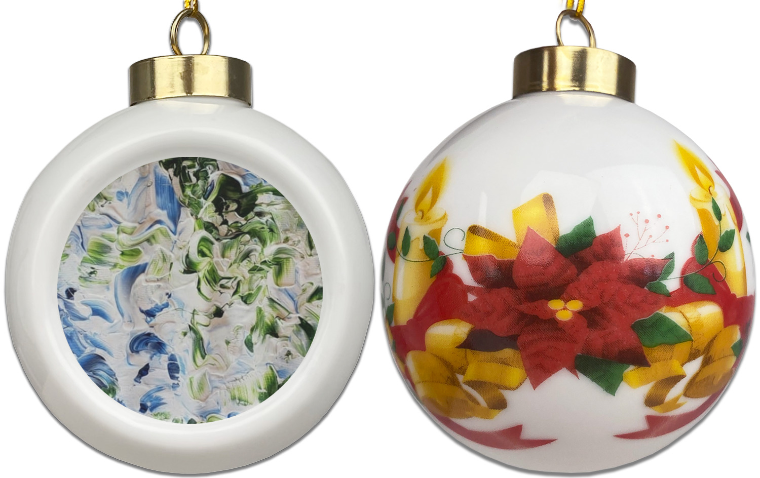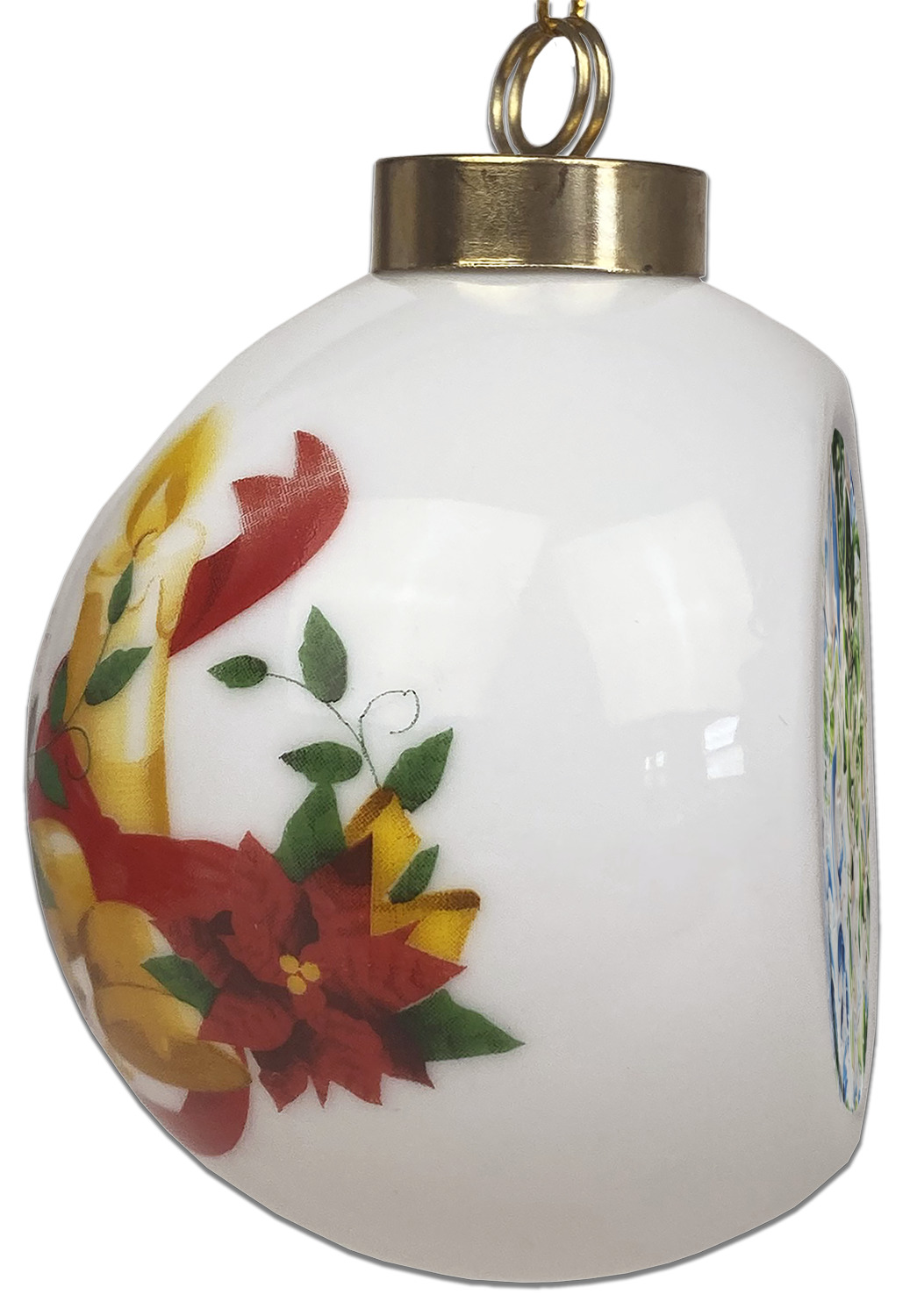 Our Christmas ornaments are a unique ceramic ball shape with a twist as it has a flat face to display your custom design! Select from one of our two design types - Christmas Tree or Poinsettia Garland - to adorn the curved back of your personal design. Each ornament measures 3H x 2.5W x 2D accompanied with a gold string accent for finishing touches to hang on your beautiful Christmas tree!