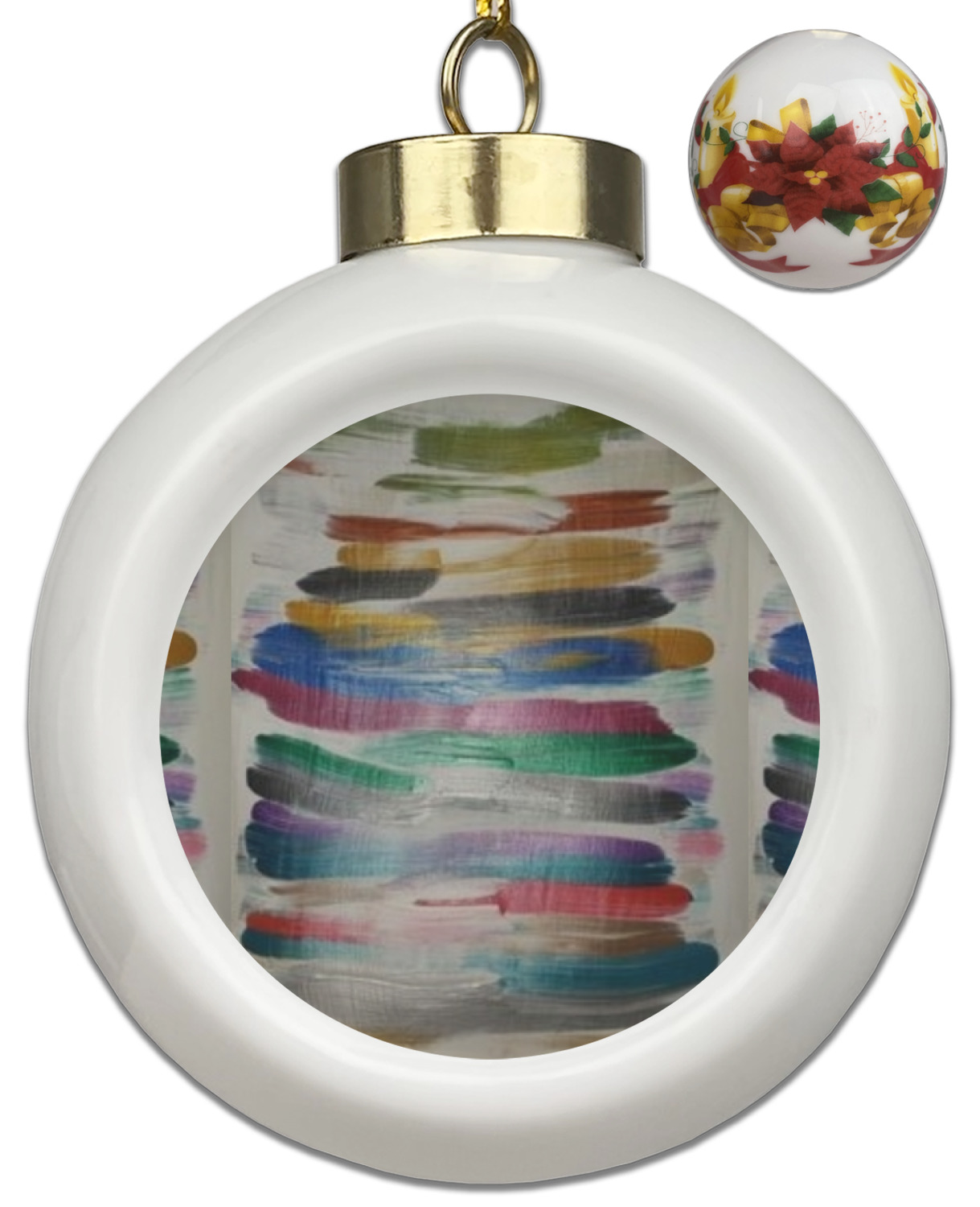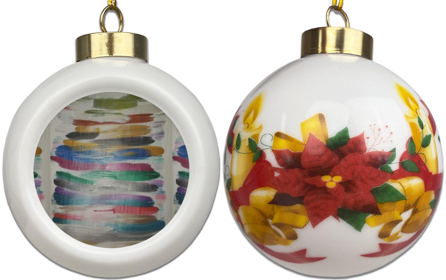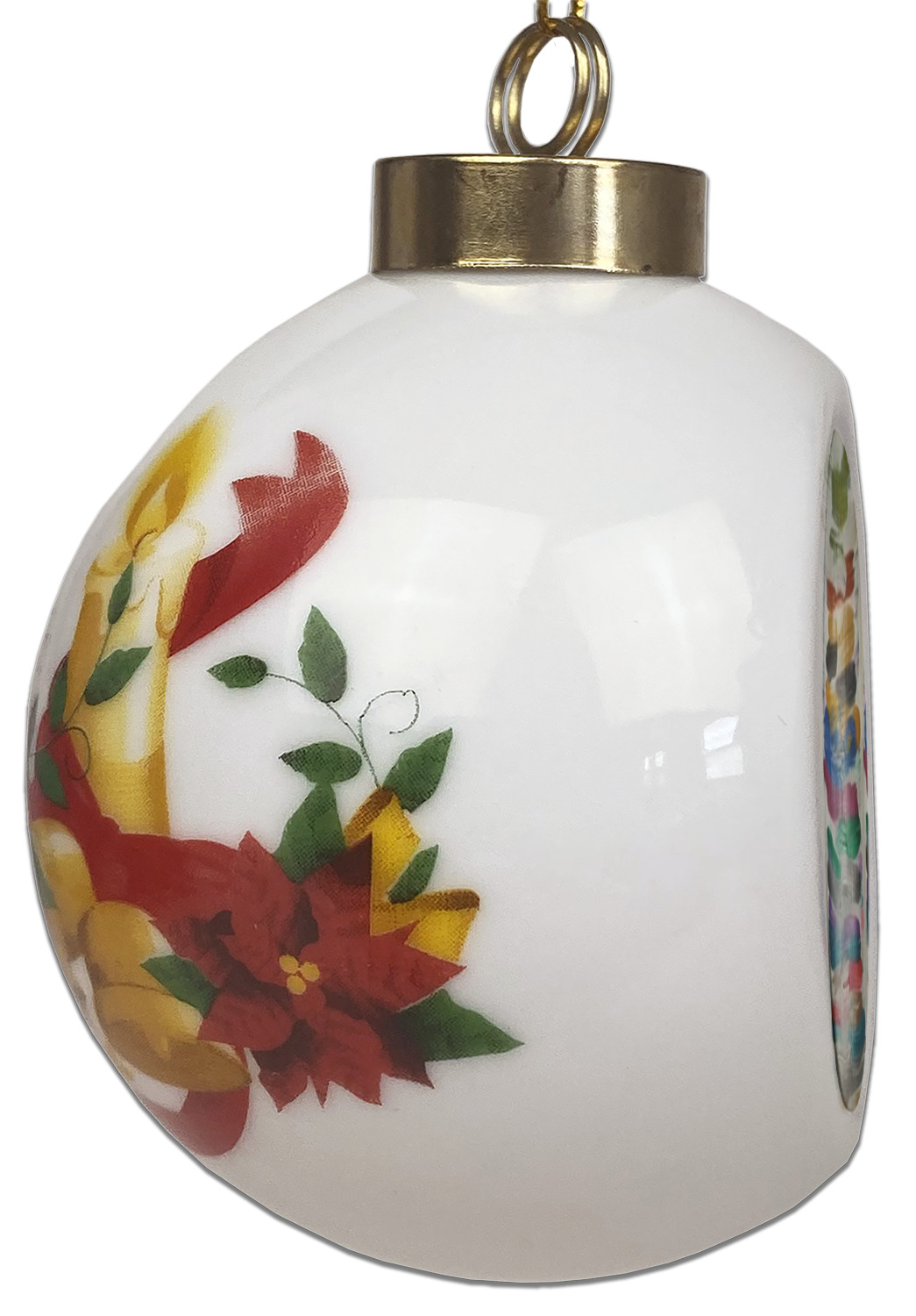 Our Christmas ornaments are a unique ceramic ball shape with a twist as it has a flat face to display your custom design! Select from one of our two design types - Christmas Tree or Poinsettia Garland - to adorn the curved back of your personal design. Each ornament measures 3H x 2.5W x 2D accompanied with a gold string accent for finishing touches to hang on your beautiful Christmas tree!