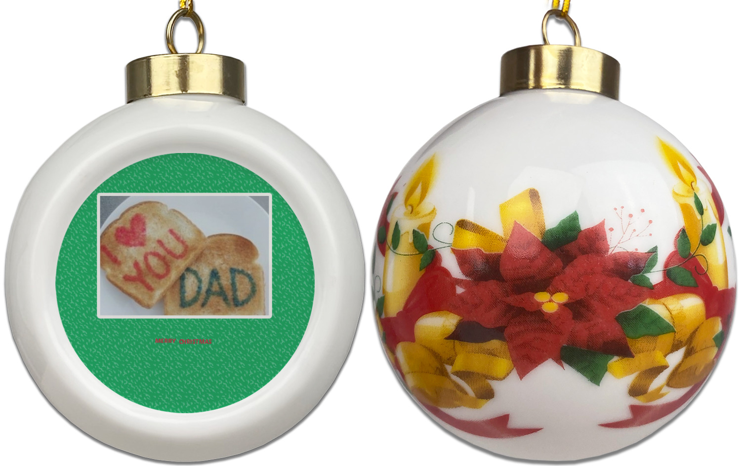 Our Christmas ornaments are a unique ceramic ball shape with a twist as it has a flat face to display your custom design! Select from one of our two design types - Christmas Tree or Poinsettia Garland - to adorn the curved back of your personal design. Each ornament measures 3H x 2.5W x 2D accompanied with a gold string accent for finishing touches to hang on your beautiful Christmas tree!