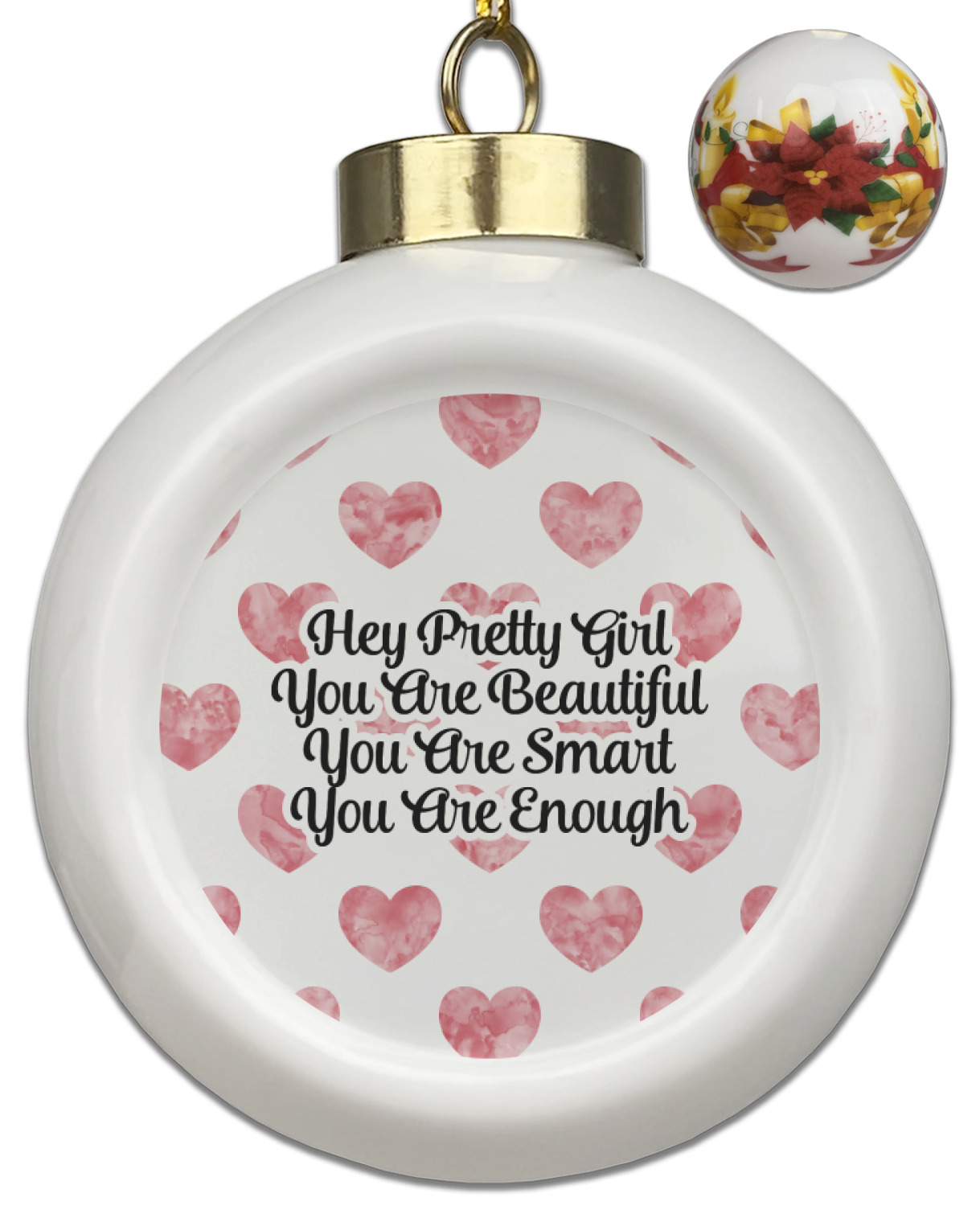 Our Christmas ornaments are a unique ceramic ball shape with a twist as it has a flat face to display your custom design! Select from one of our two design types - Christmas Tree or Poinsettia Garland - to adorn the curved back of your personal design. Each ornament measures 3H x 2.5W x 2D accompanied with a gold string accent for finishing touches to hang on your beautiful Christmas tree!
