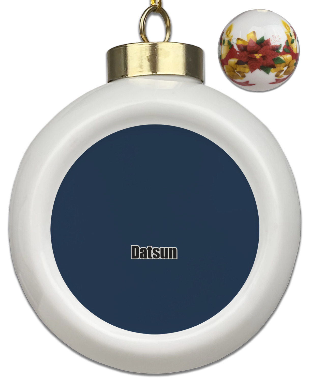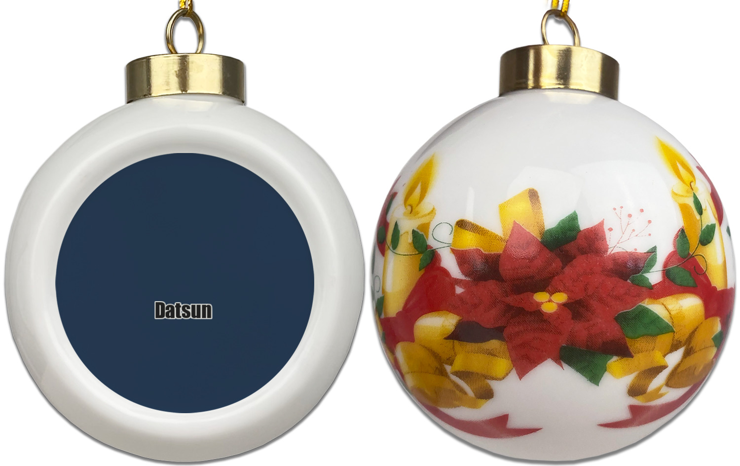 Our Christmas ornaments are a unique ceramic ball shape with a twist as it has a flat face to display your custom design! Select from one of our two design types - Christmas Tree or Poinsettia Garland - to adorn the curved back of your personal design. Each ornament measures 3H x 2.5W x 2D accompanied with a gold string accent for finishing touches to hang on your beautiful Christmas tree!