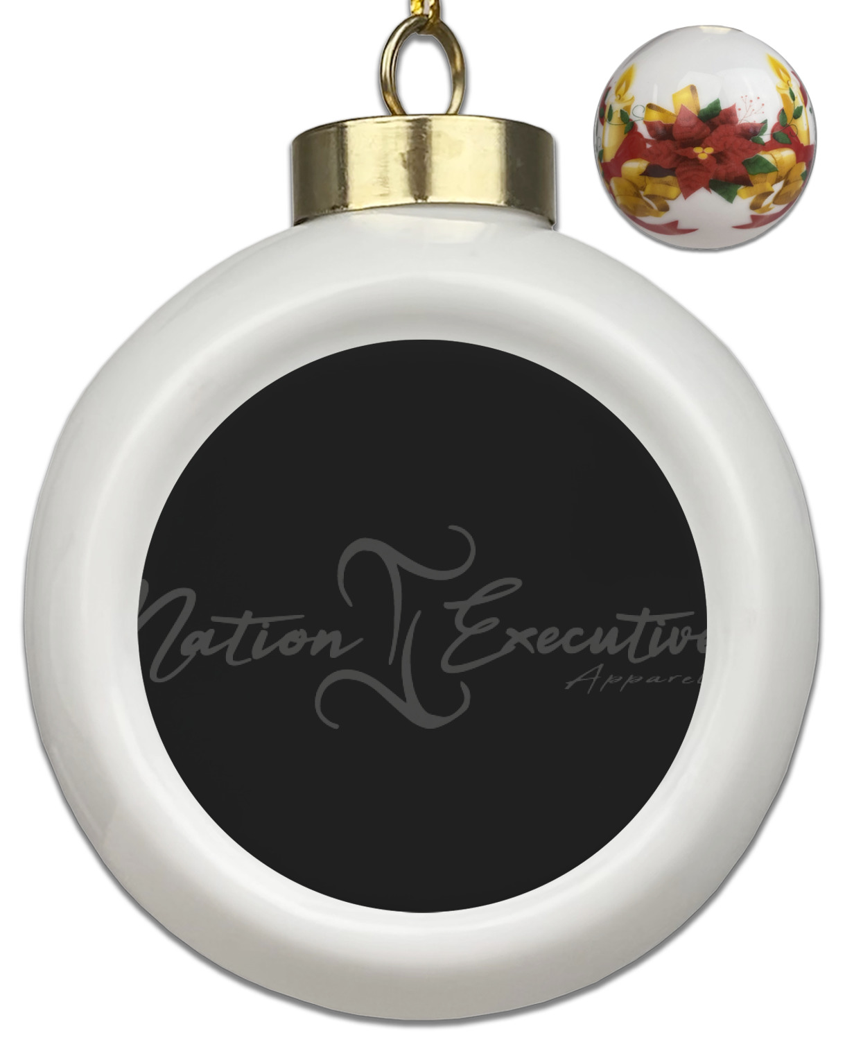 Our Christmas ornaments are a unique ceramic ball shape with a twist as it has a flat face to display your custom design! Select from one of our two design types - Christmas Tree or Poinsettia Garland - to adorn the curved back of your personal design. Each ornament measures 3H x 2.5W x 2D accompanied with a gold string accent for finishing touches to hang on your beautiful Christmas tree!