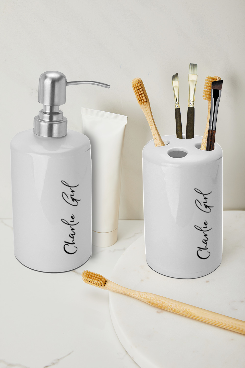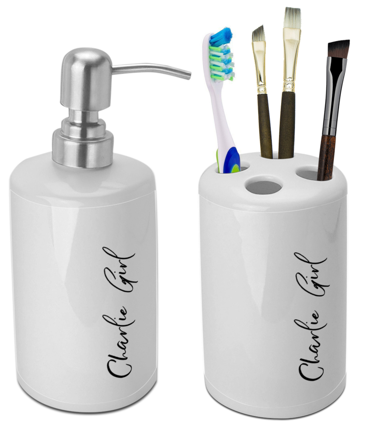 This two piece, ceramic bathroom set will add the perfect splash of color to any bathroom. This set includes one pump dispenser, ideal for soap or lotion, and one toothbrush holder with four holes. Although originally designed for toothbrushes, the holder will also hold make-up brushes, nail files, and other bathroom tools.