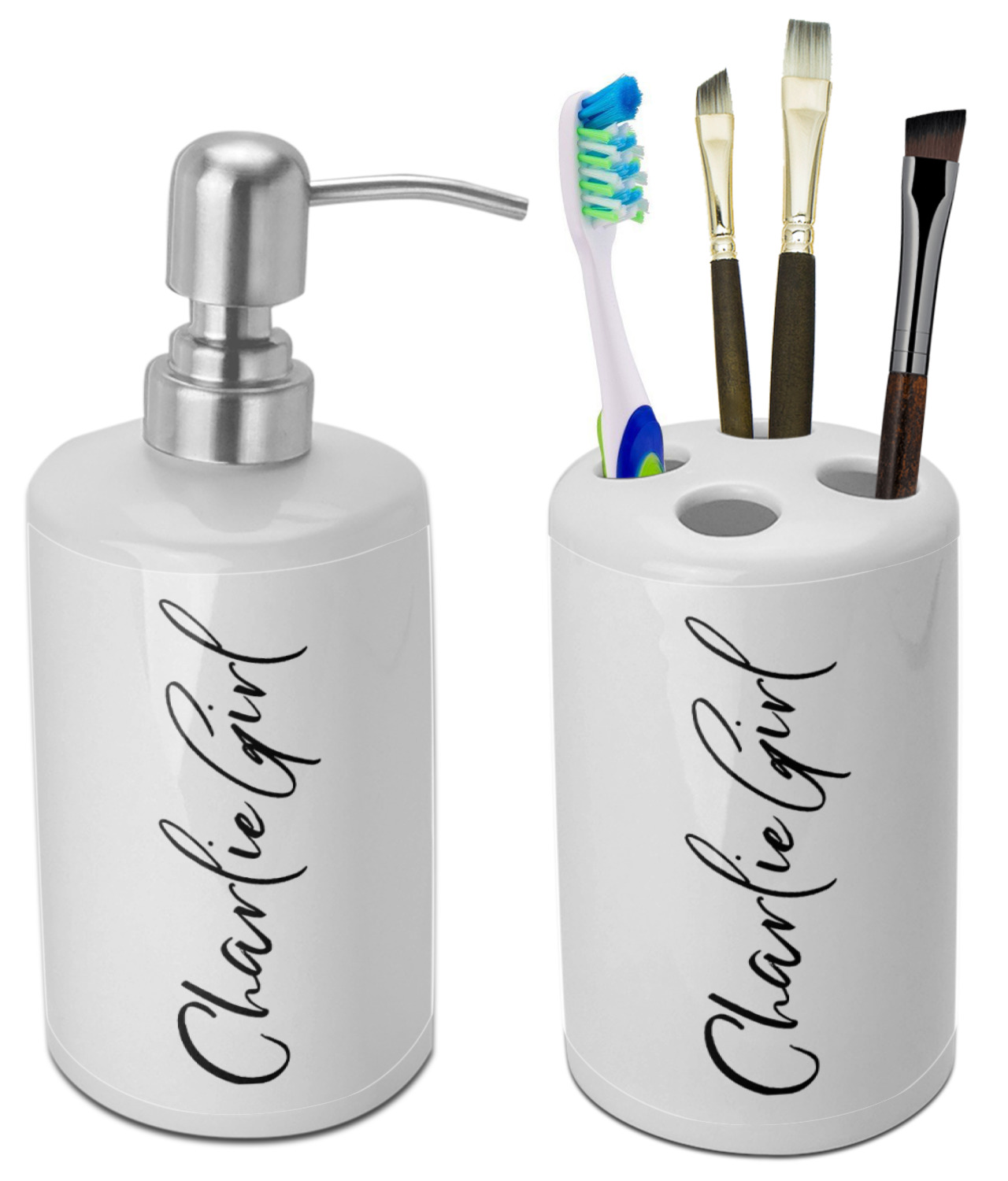 | Product Dimensions | Ceramic Soap / Lotion Dispenser (4" x 3" x 7") Ceramic Toothbrush Holder (3" x 3" x 4.5") |