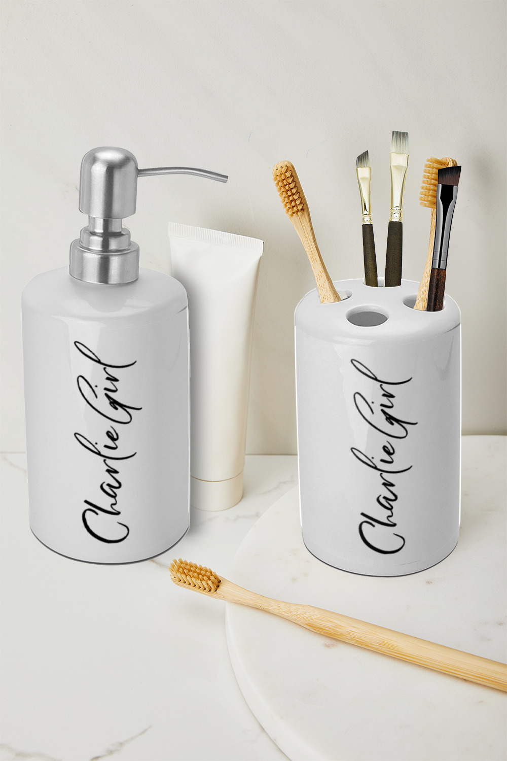 This two piece, ceramic bathroom set will add the perfect splash of color to any bathroom. This set includes one pump dispenser, ideal for soap or lotion, and one toothbrush holder with four holes. Although originally designed for toothbrushes, the holder will also hold make-up brushes, nail files, and other bathroom tools.