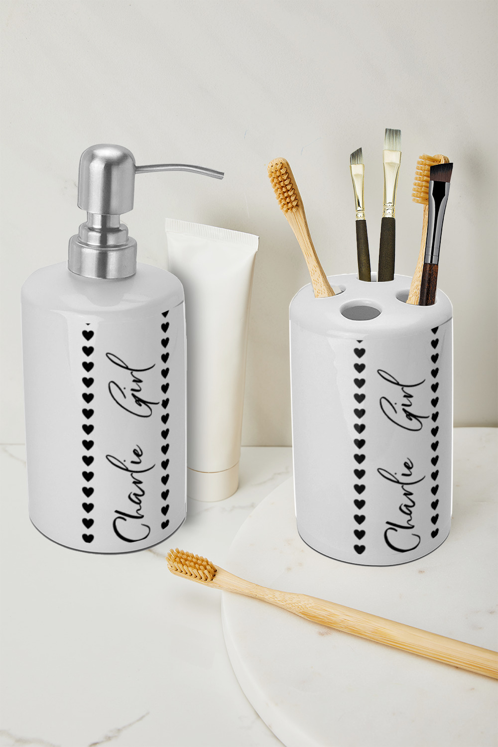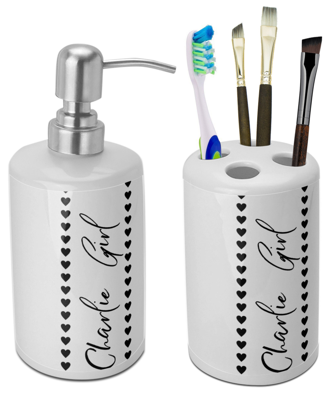 This two piece, ceramic bathroom set will add the perfect splash of color to any bathroom. This set includes one pump dispenser, ideal for soap or lotion, and one toothbrush holder with four holes. Although originally designed for toothbrushes, the holder will also hold make-up brushes, nail files, and other bathroom tools.