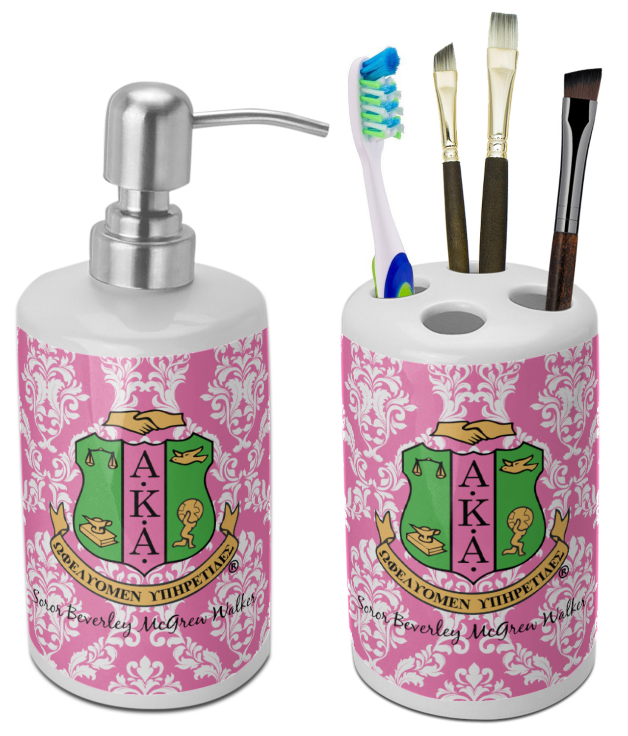 This two piece, ceramic bathroom set will add the perfect splash of color to any bathroom. This set includes one pump dispenser, ideal for soap or lotion, and one toothbrush holder with four holes. Although originally designed for toothbrushes, the holder will also hold make-up brushes, nail files, and other bathroom tools.
