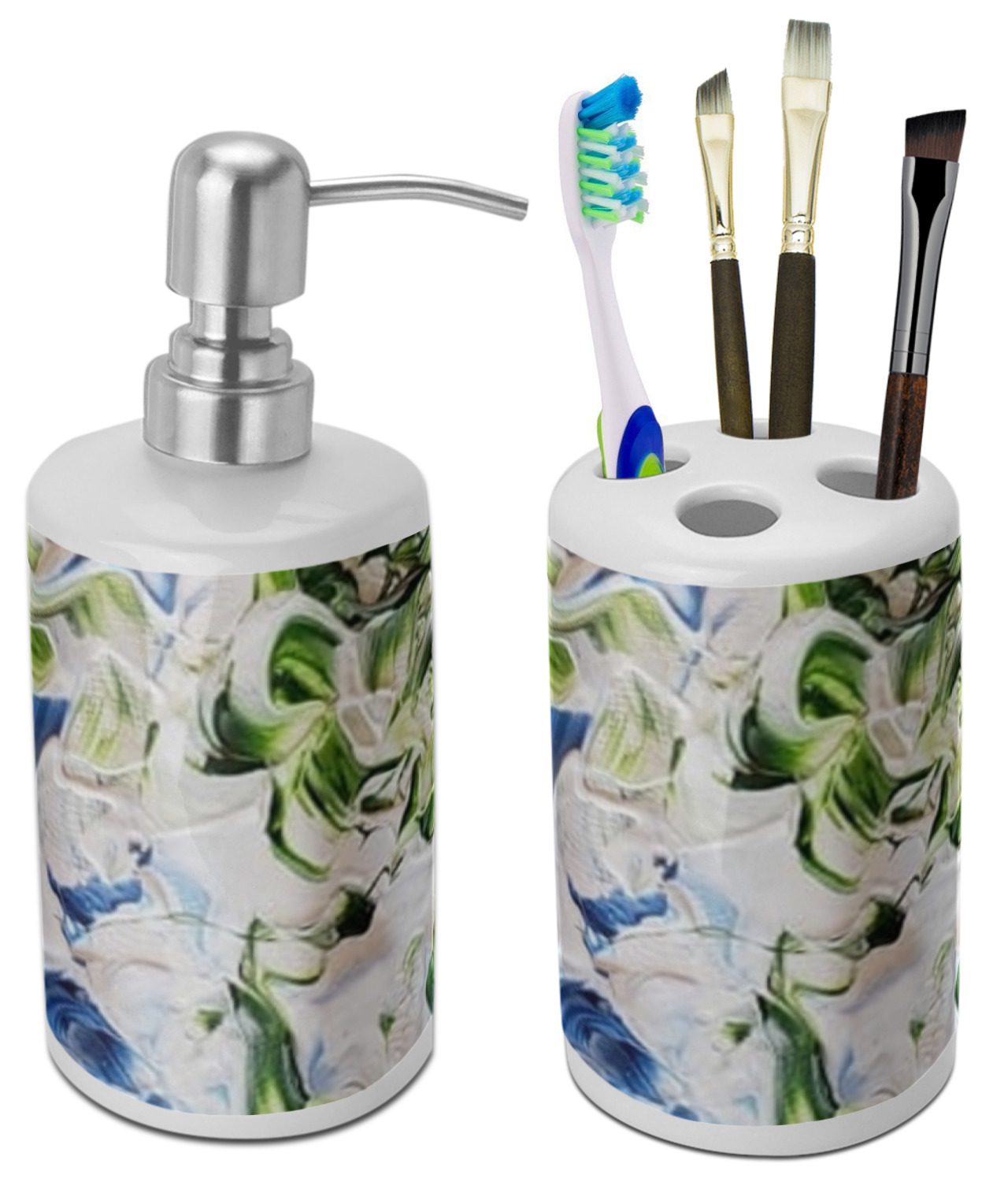 This two piece, ceramic bathroom set will add the perfect splash of color to any bathroom. This set includes one pump dispenser, ideal for soap or lotion, and one toothbrush holder with four holes. Although originally designed for toothbrushes, the holder will also hold make-up brushes, nail files, and other bathroom tools.