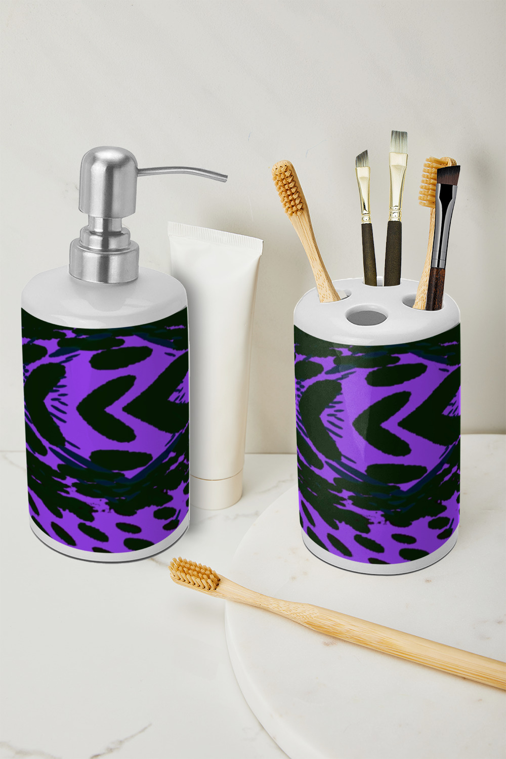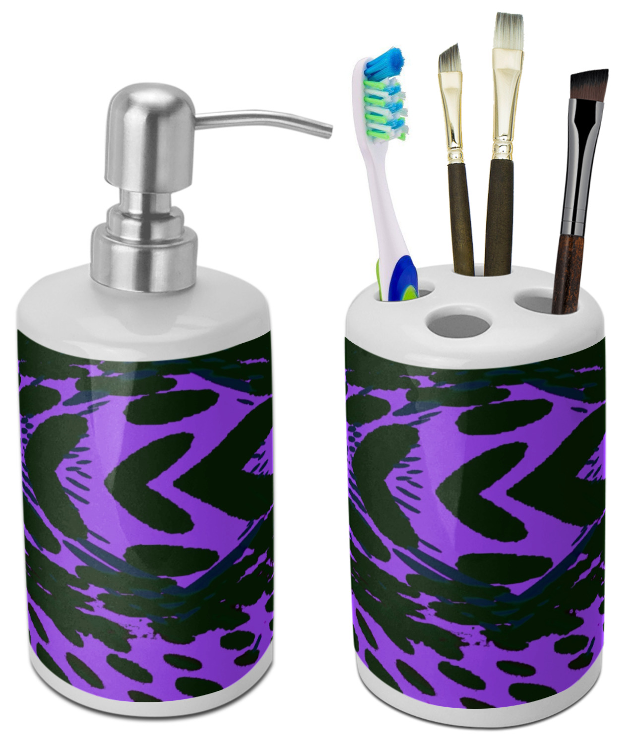 This two piece, ceramic bathroom set will add the perfect splash of color to any bathroom. This set includes one pump dispenser, ideal for soap or lotion, and one toothbrush holder with four holes. Although originally designed for toothbrushes, the holder will also hold make-up brushes, nail files, and other bathroom tools.