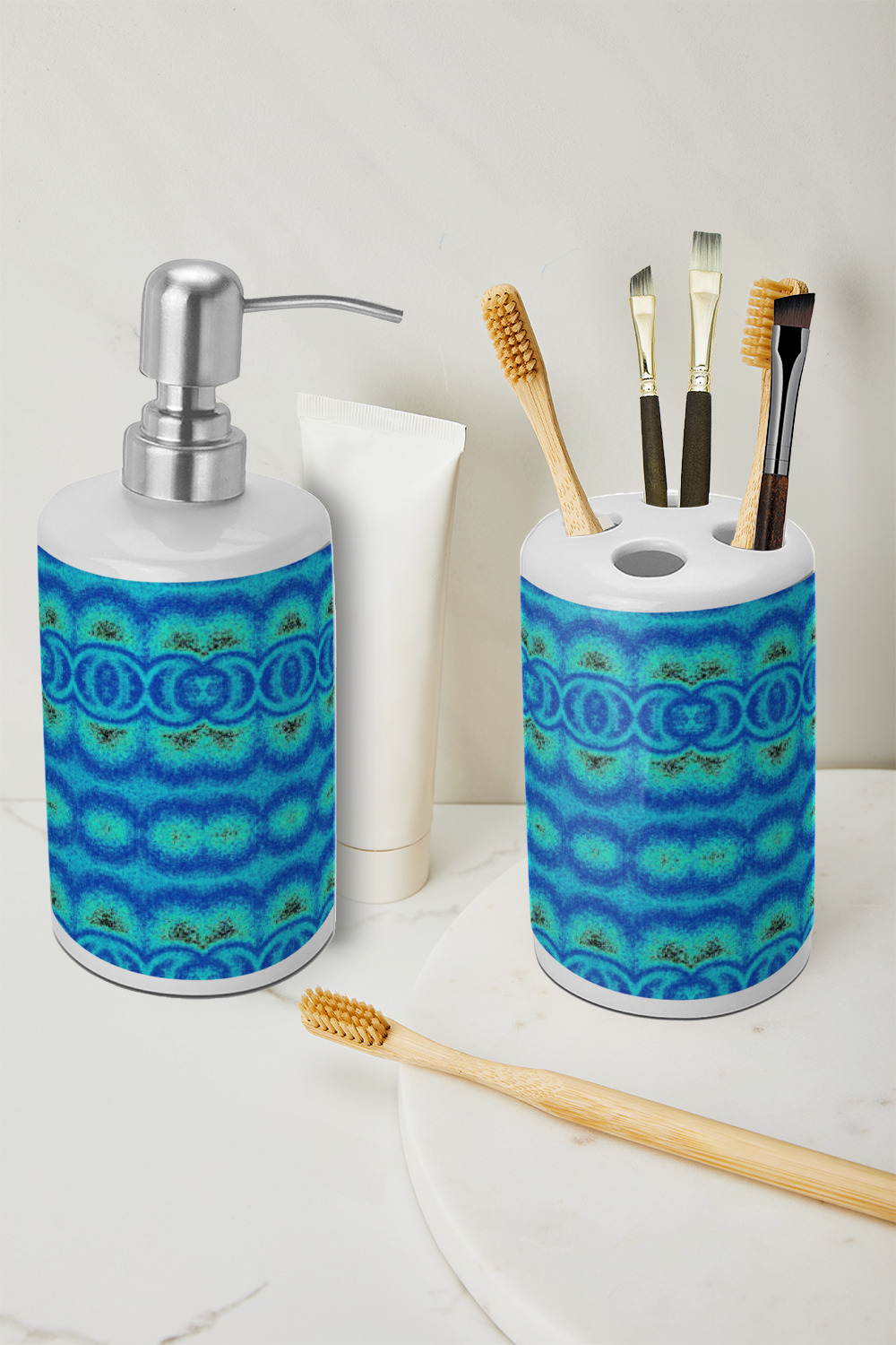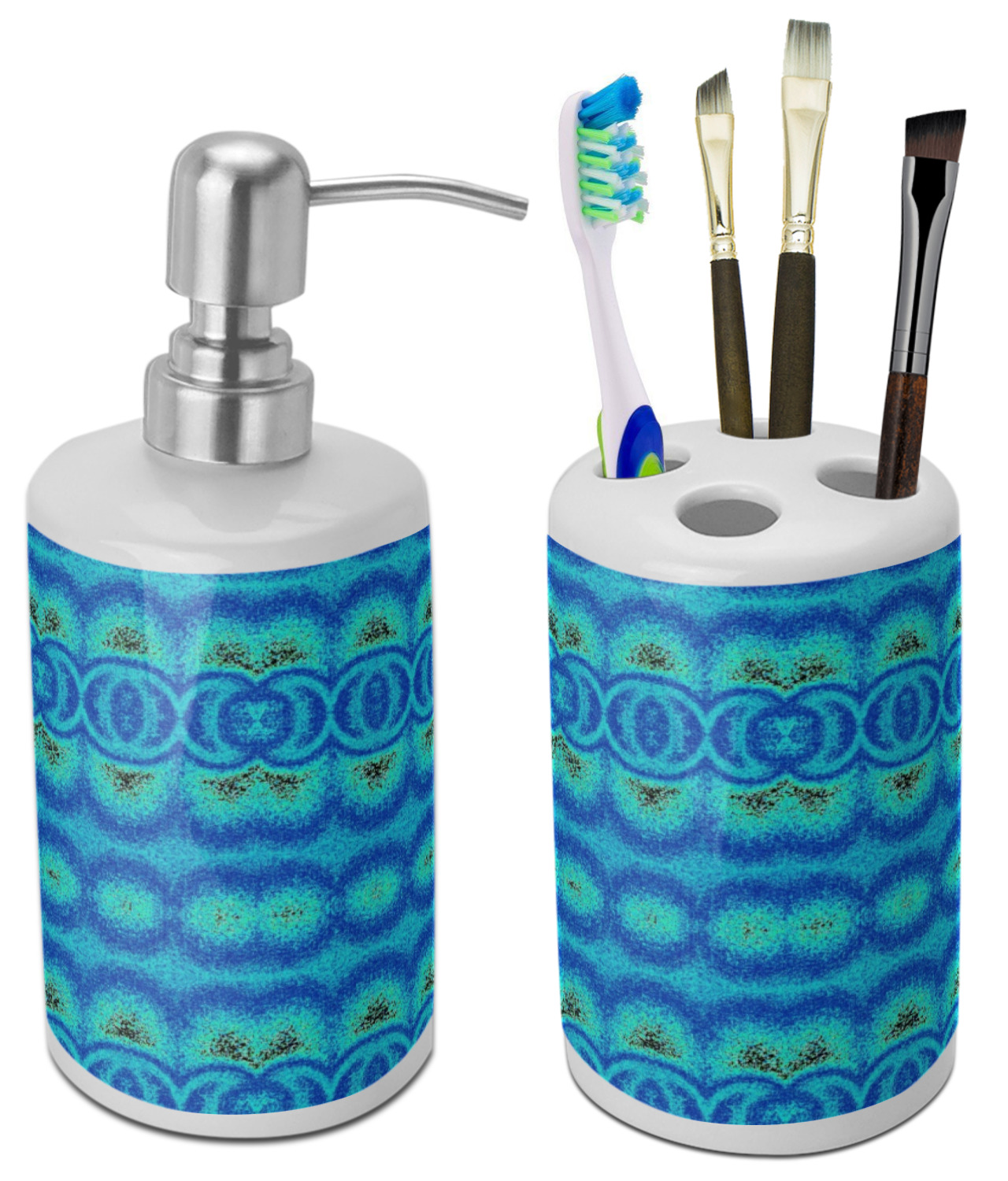 This two piece, ceramic bathroom set will add the perfect splash of color to any bathroom. This set includes one pump dispenser, ideal for soap or lotion, and one toothbrush holder with four holes. Although originally designed for toothbrushes, the holder will also hold make-up brushes, nail files, and other bathroom tools.
