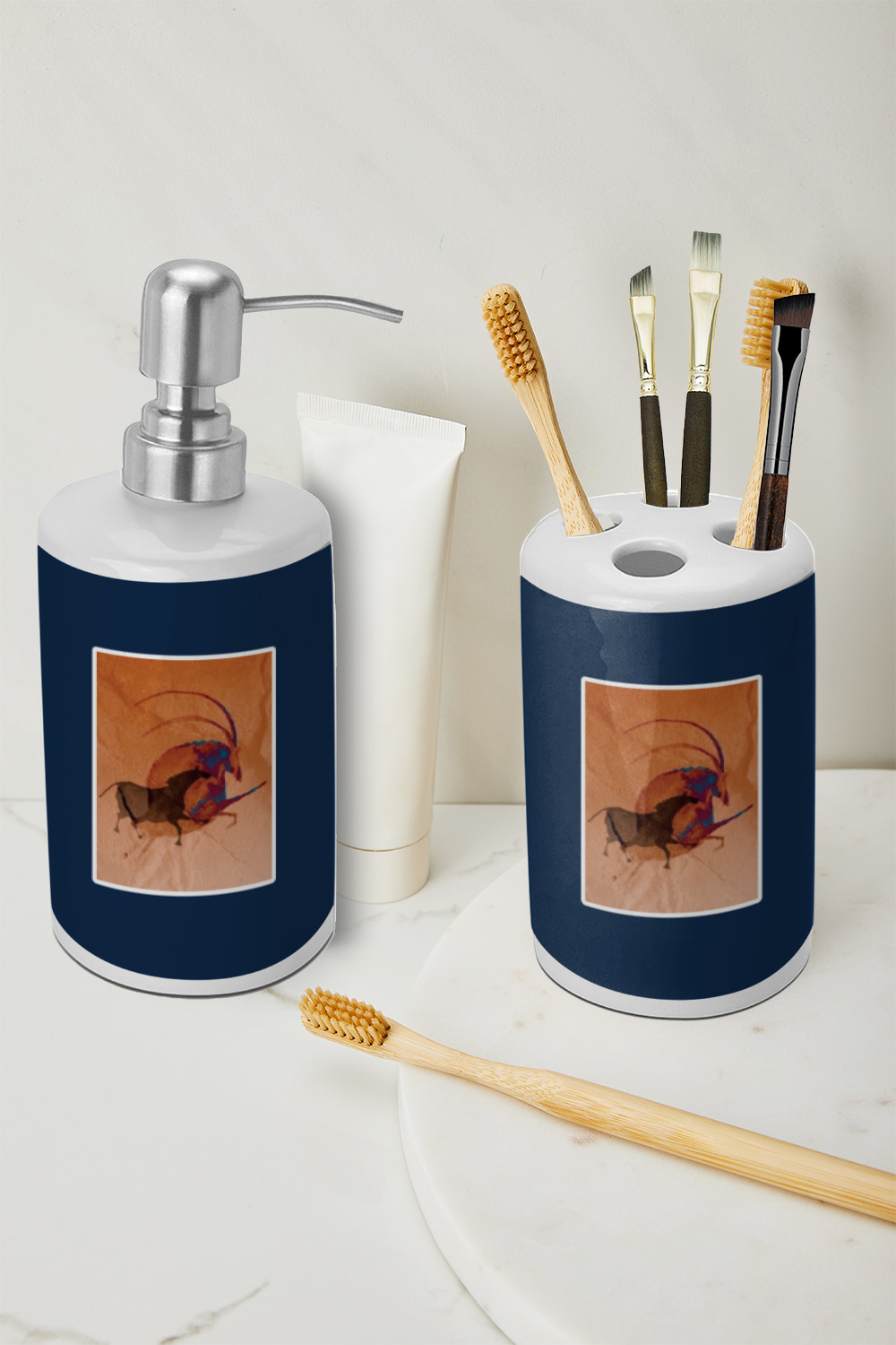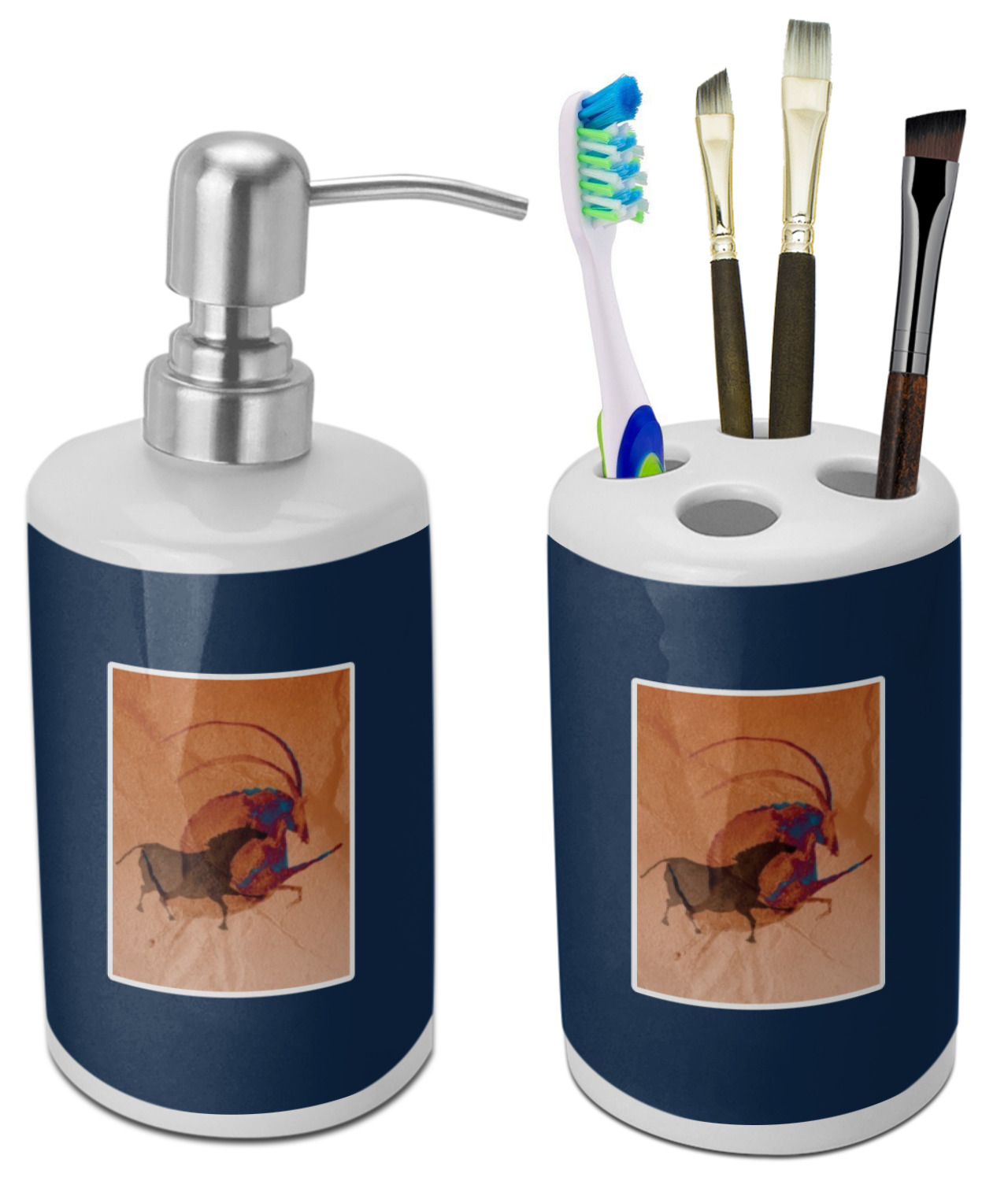 This two piece, ceramic bathroom set will add the perfect splash of color to any bathroom. This set includes one pump dispenser, ideal for soap or lotion, and one toothbrush holder with four holes. Although originally designed for toothbrushes, the holder will also hold make-up brushes, nail files, and other bathroom tools.