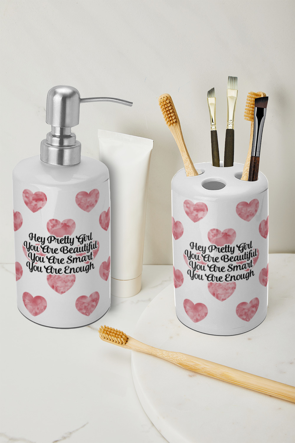This two piece, ceramic bathroom set will add the perfect splash of color to any bathroom. This set includes one pump dispenser, ideal for soap or lotion, and one toothbrush holder with four holes. Although originally designed for toothbrushes, the holder will also hold make-up brushes, nail files, and other bathroom tools.
