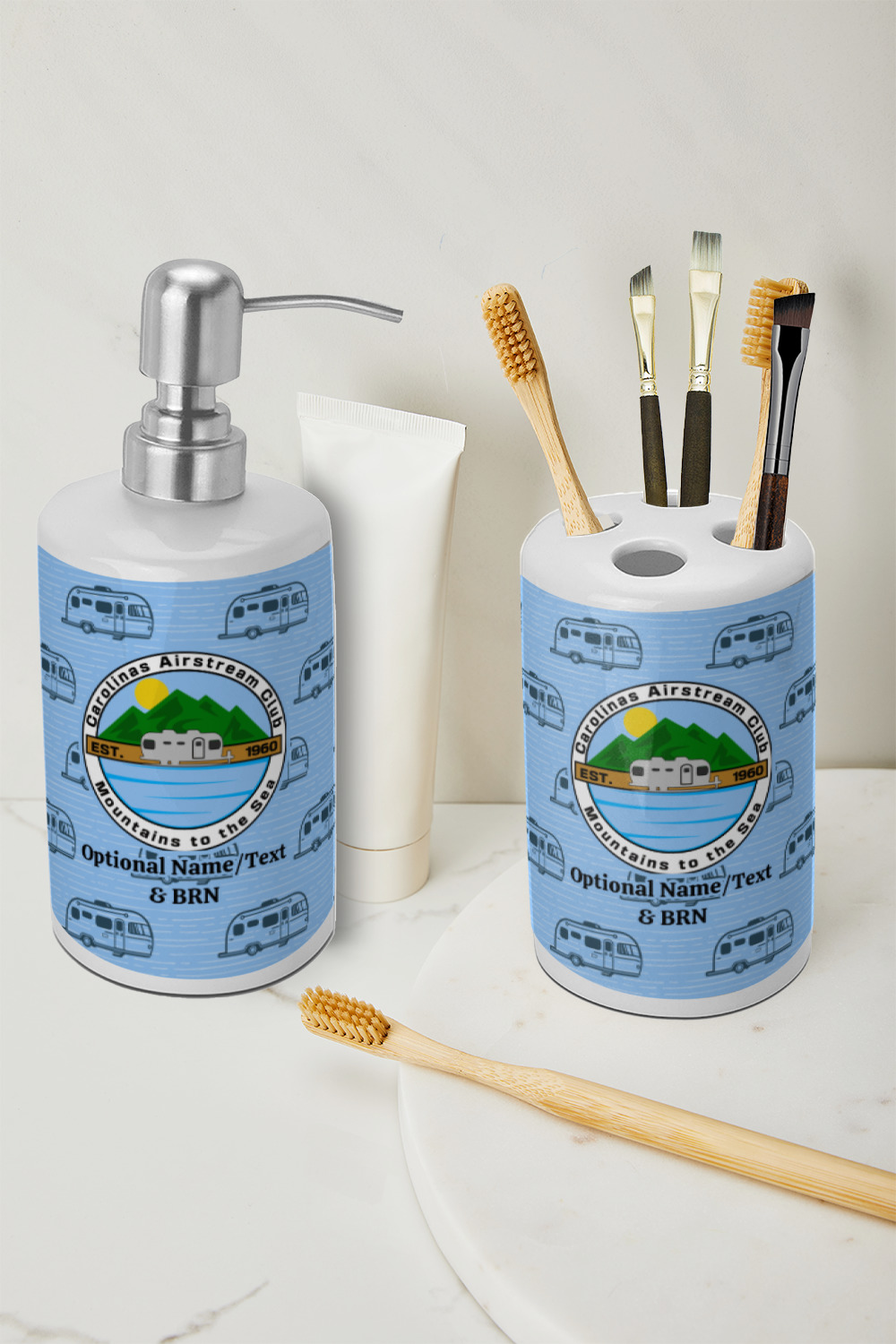 This two piece, ceramic bathroom set will add the perfect splash of color to any bathroom. This set includes one pump dispenser, ideal for soap or lotion, and one toothbrush holder with four holes. Although originally designed for toothbrushes, the holder will also hold make-up brushes, nail files, and other bathroom tools.
