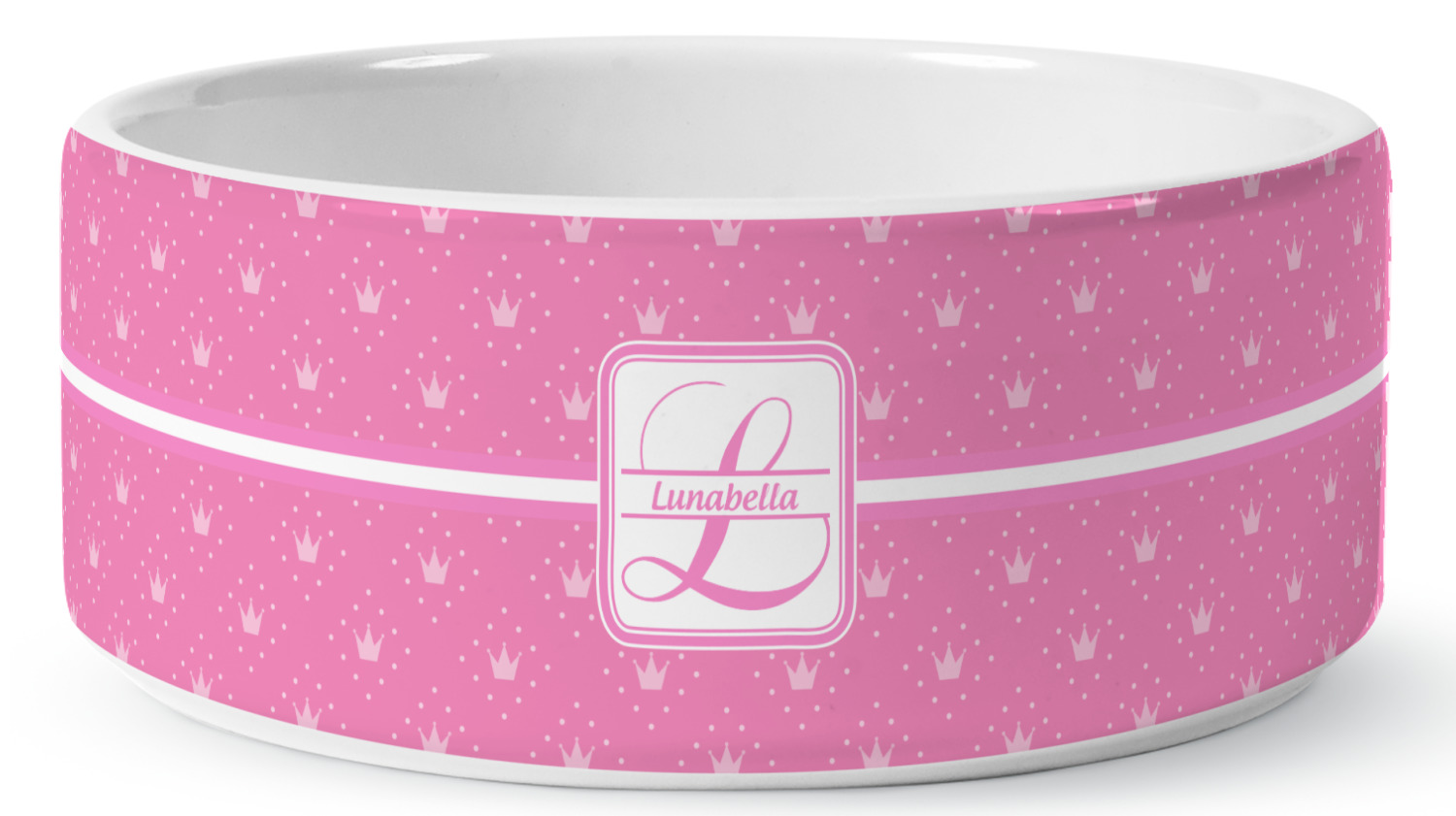 We carry these custom dog bowls in two available sizes: medium and large.The medium is 6 inches in diameter and 2.5 inches tall, and can therefore suit pets who eat up to 2.5 cups of food per meal. The large pet bowl is 7 inches in diameter and 3 inches tall, and suits pets who require up to 4.5 cups of food per meal.